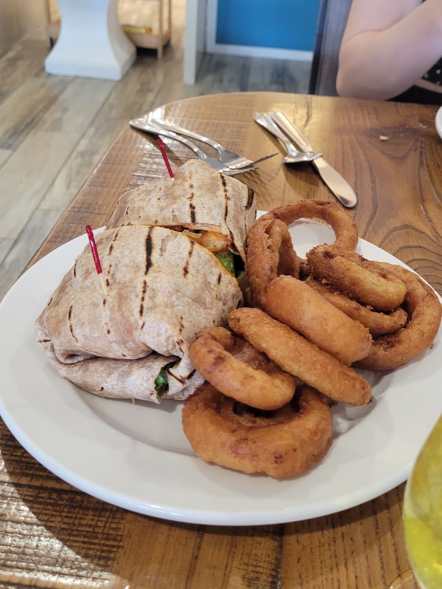 We stopped for lunch after long flight from MI, opted for indoor seating as we were not dressed for the heat of the keys. Servers were very accommodating as there was no one sitting inside. I add the coconut shrimp and sweet potato fries, both were very good! Husband had the Buffalo chicken wrap w/ onion rings , again both very good. Daughters enjoyed the chicken quesadilla and turkey BLT.