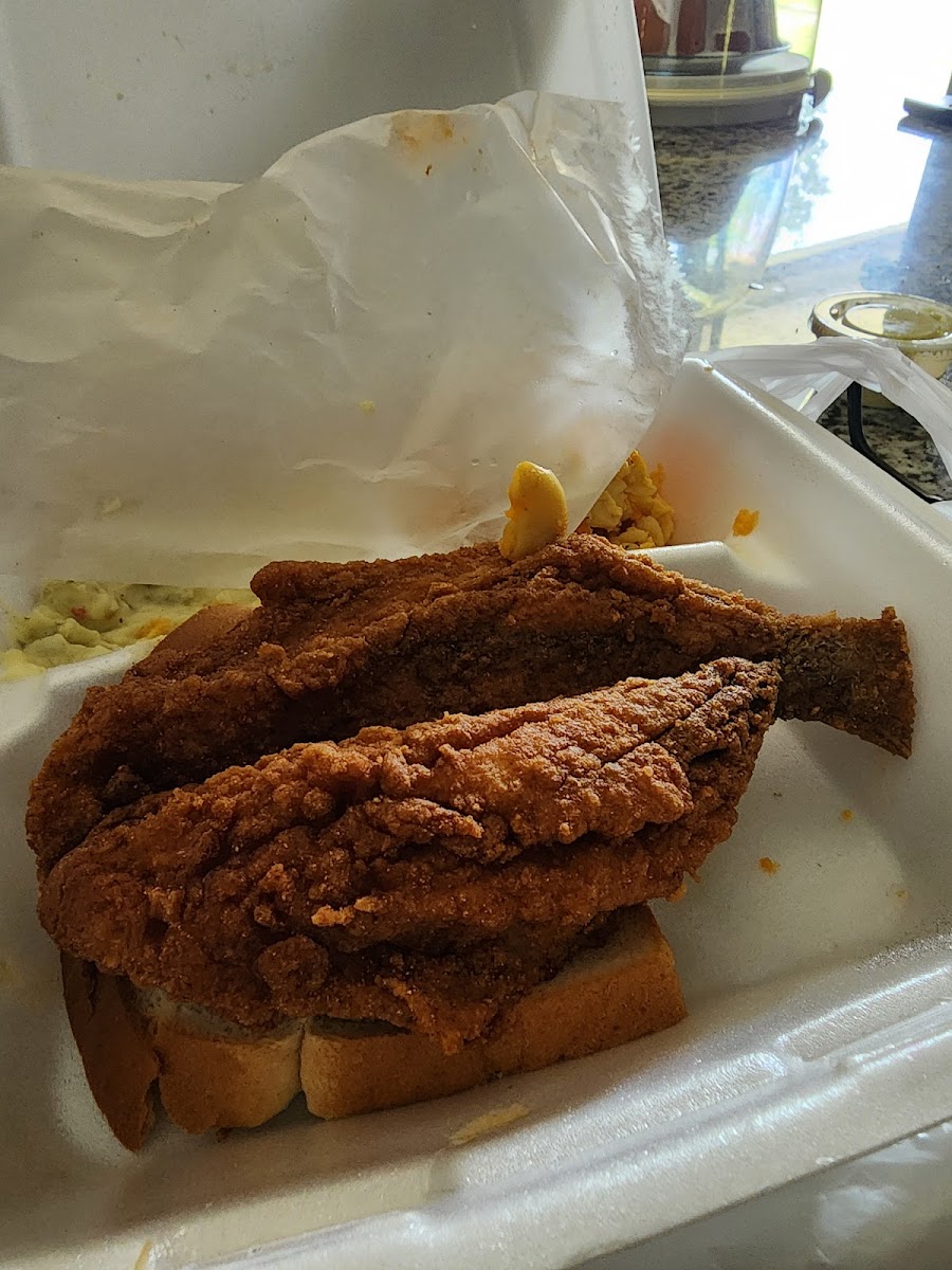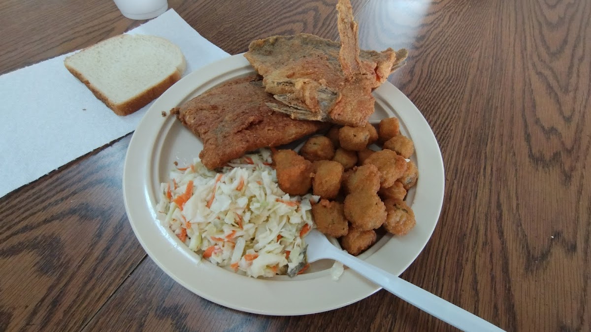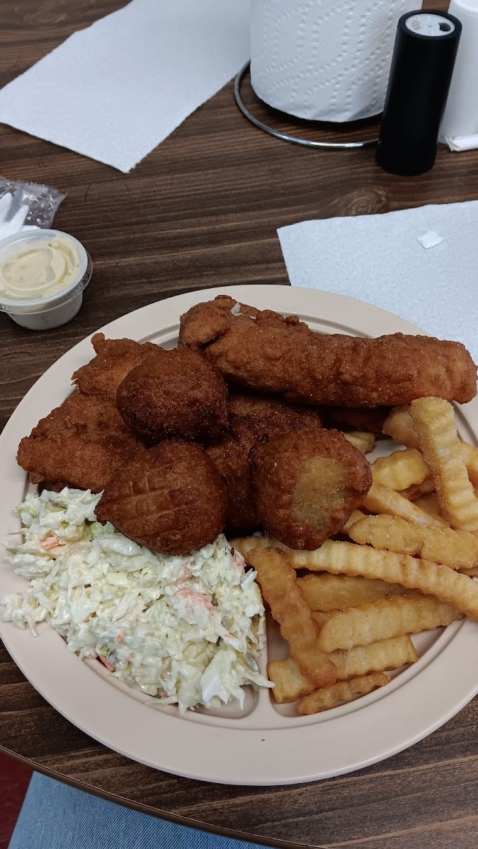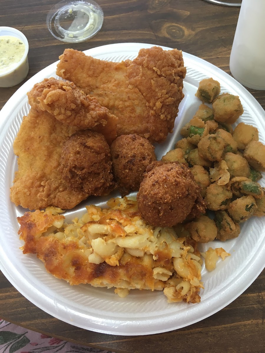 I visited this restaurant per my aunt’s request. I ordered the flounder dinner with onion rings and Mac and cheese. My mom and my aunt ordered the catfish with French fries, coleslaw and potato salad. Everything was good except for my mom’s potato salad she said it was soupy. And the homemade tartar sauce was not that good it was okay. The service was good overall. Everyone was friendly. They forgot to put tartar sauce in my bag which I had to go back for. Which ultimately we didn’t even like that much. But you must get the Mac and cheese that was really good. Plus the hush puppies were delicious. The prices were decent I have no complaints about that. The restaurant was cute it had that small town cozy feel.