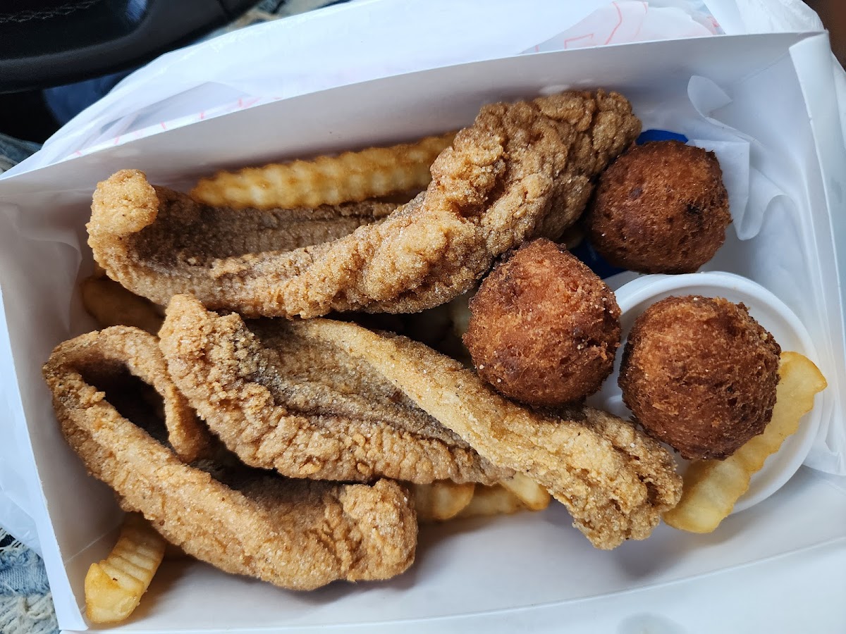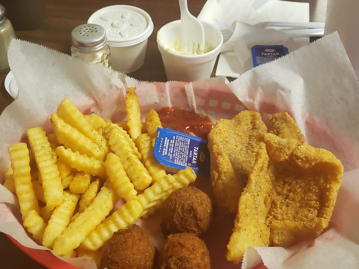 Best in town! Fries are perfectly crispy on the outside with a soft Center and all so good! Shrimp amazing as always. Best hushpuppies in town and anywhere I've had them. Just the best!