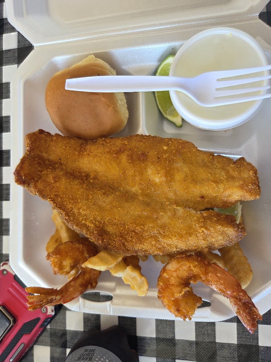 Update: I brought my family to try the food out. One had their shrimp boil, and the other two had two different kinds of plate with drum. It was good. Warning, if you are planning to eat there, it is a small area and very warm inside. But the food was good! Great food! I got the special, 6 shrimp and fish. The shrimp were large size and in a mixture of cornmeal and flour type of breading. The fish was Drum fish in a cornmeal type of breading, nicely fried where the tips were crunchy but the fish was not over fried. The waffle fries could have been a little better and not just placed in the tray for the fish and shrimp to drain. Very professional way of ordering, given a restaurant beeper that vibrated when food was done. Only one man managing the front slipping behind the door to grab orders.