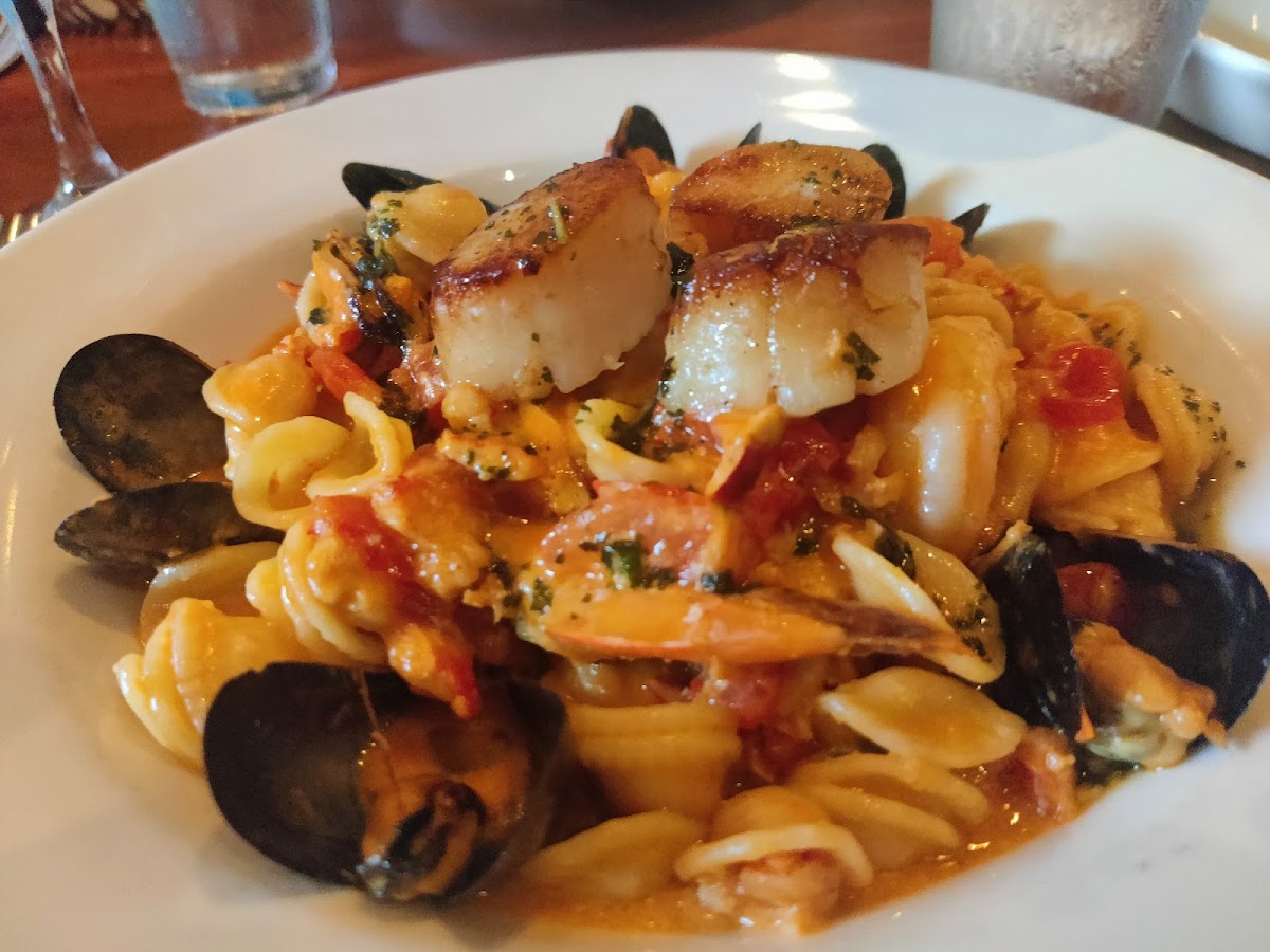 Nice place and good service. We tried the Salmon/scallops with squash? Puree, the Sea bass with pasta (the pasta could be a bit salty for some tastes), and the snapper with mashed potatoes, but the Seafood pasta was the best. The kids menu only has three options but are huge and the fries really good. They let you BYOB and the prices are reasonable, high 20-30s per entree. We went at 6:30 pm on a Sunday and there were plenty of tables but by the time we left, ~8 pm, people had to wait.