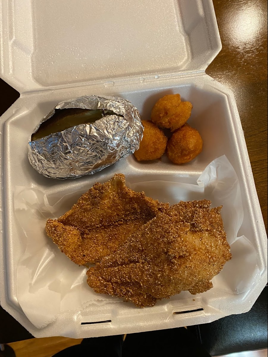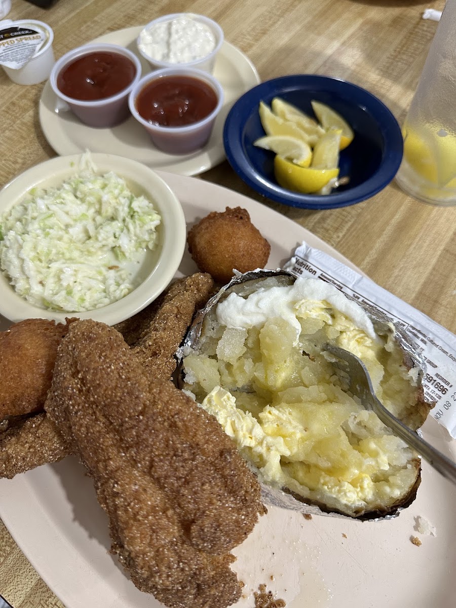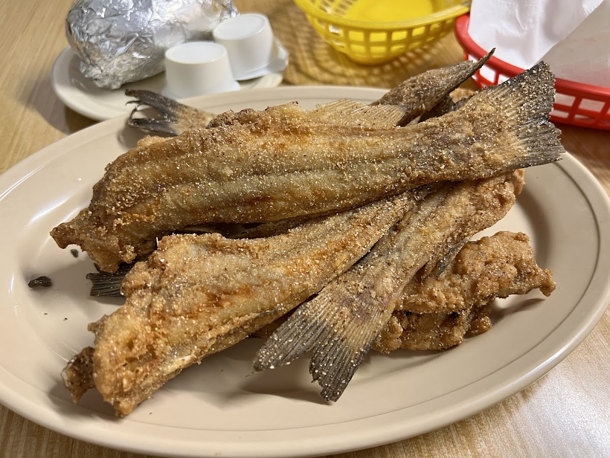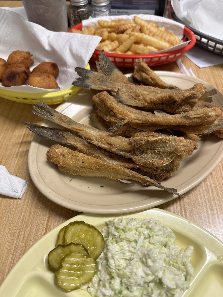 We had a group of 10 and everyone got catfish. Both bone in and filets were good. Not the best but good. The sides were very his especially the slaw.