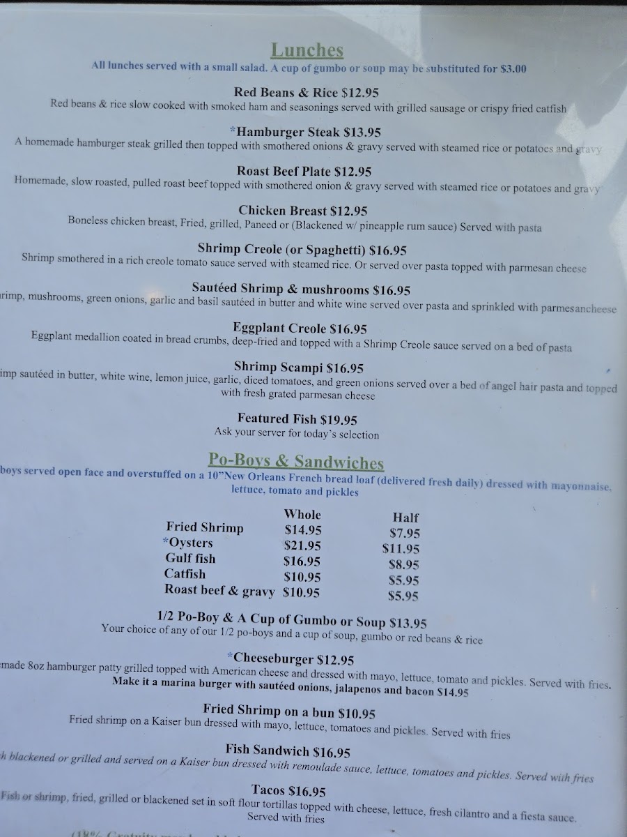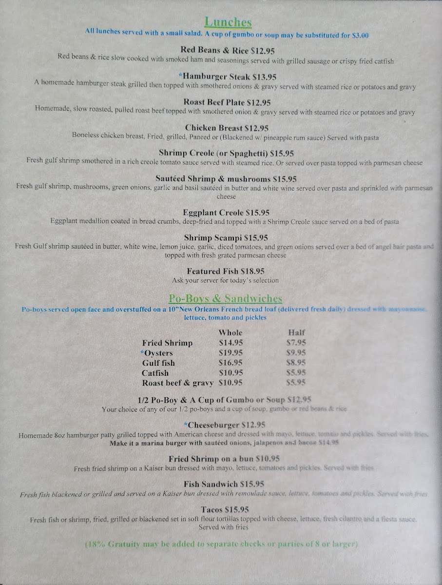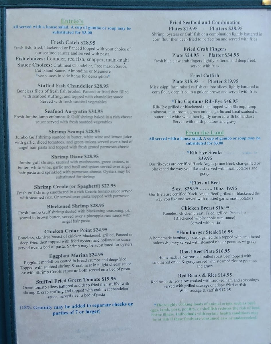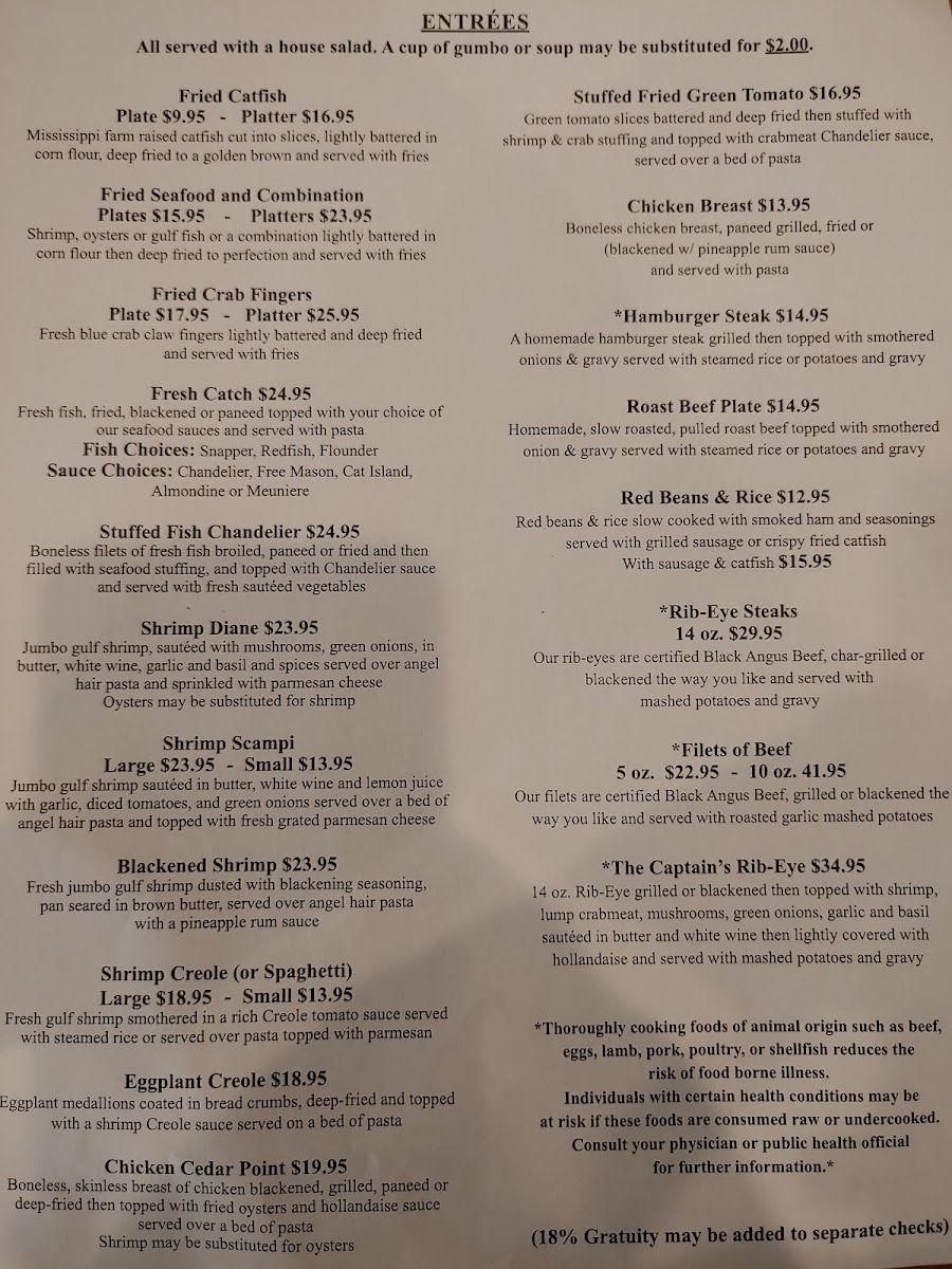 Fresh fish, fried, blackened or paneed topped with your choice of our seafood sauces and served with pasta fish choices: flounder, red fish, snapper, mahi-mahi sauce choices: crabmeat chandelier, free mason sauce, cat island sauce, almondine or meuniere *see sauces in side items for description*