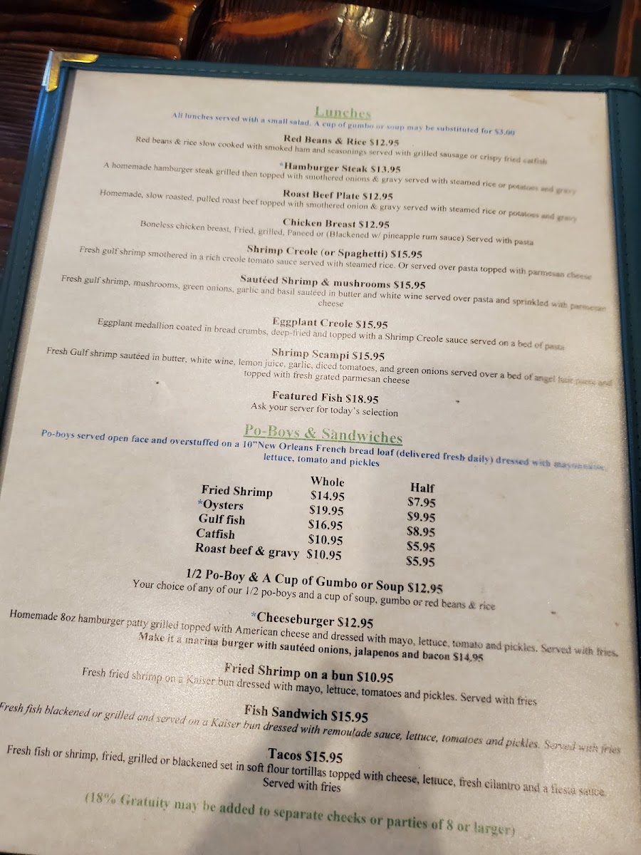 Jumbo gulf shrimp, sautéed with mushrooms, green onions, in butter, white wine, garlic and basil and spices served over angel hair pasta and sprinkled with parmesan cheese. Oysters may be substituted for shrimp