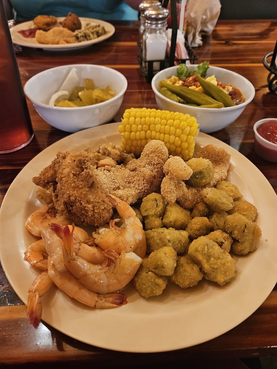 Greeted with Southern hospitality as soon as you walk thru the door. This place can feed a crowd and they know how to do it. Place was packed at 5 pm on a Saturday, and we still got in/out in under an hour. Gave it 4 stars on Food only bc I wish they had a few more vegetable options to help even out all the fried foods, but all in all an excellent experience. Will Def be back and recommend it to friends/family.