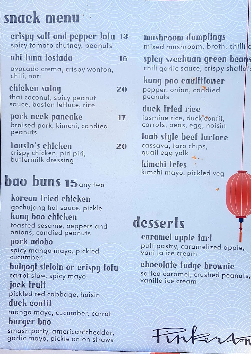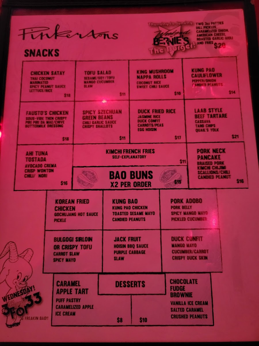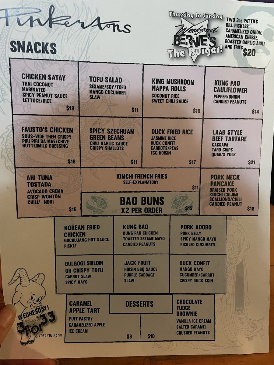 Baogolgi Bulgogi marinated sirloin topped with spicy mayo and carrot slaw Kung Bao Kung pao chicken topped with toasted sesame mayo and candied peanuts Duck Confit Bao Duck confit with apricot sriracha mayo, cucumber, carrot, and crispy duck skin Pork Adobao Pork belly adobo with spicy mango mayo, pickled cucumber Jack Baoer Pulled jackfruit tossed in hoisin BBQ sauce topped with purple cabbage slaw. Vegetarian Korean Fried Chicken Bao Deep fried boneless chicken, gochujang hot sauce, pickle Tofu Bao Crispy tofu, spicy mayo & carrot slaw. Vegetarian