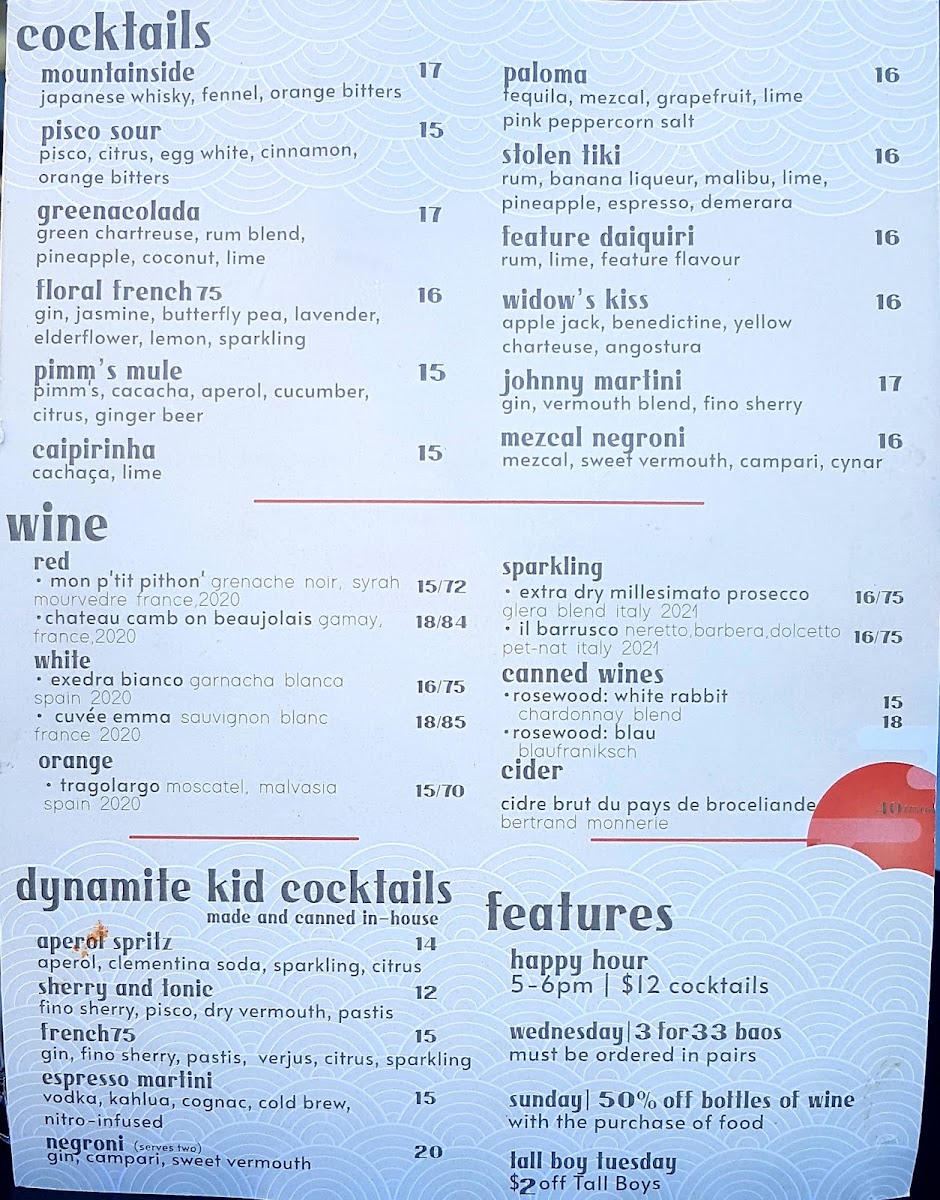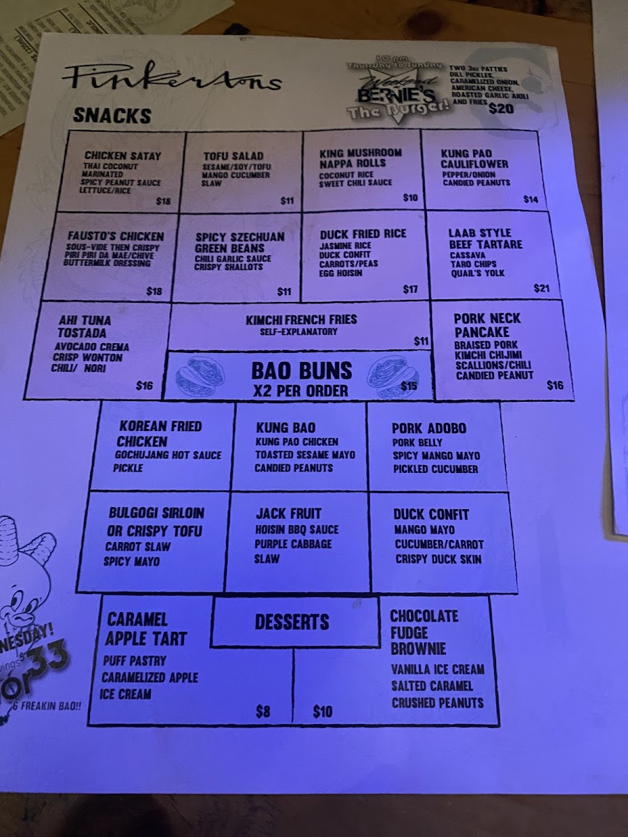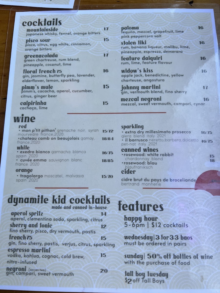 Baogolgi Bulgogi marinated sirloin topped with spicy mayo and carrot slaw Kung Bao Kung pao chicken topped with toasted sesame mayo and candied peanuts Duck Confit Bao Duck confit with apricot sriracha mayo, cucumber, carrot, and crispy duck skin Pork Adobao Pork belly adobo with spicy mango mayo, pickled cucumber Jack Baoer Pulled jackfruit tossed in hoisin BBQ sauce topped with purple cabbage slaw. Vegetarian Korean Fried Chicken Bao Deep fried boneless chicken, gochujang hot sauce, pickle Tofu Bao Crispy tofu, spicy mayo & carrot slaw. Vegetarian