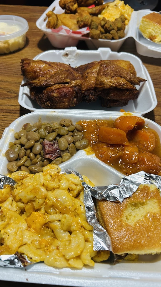 Absolutely delicious! Veggie plate for me, fried whiting for hubby. Those sweet potatoes…!!!!! Mmmmm and the cornbread!?!?! Light airy, perfect amount of sweet… EVERYTHING was good! Will definitely be back!!
