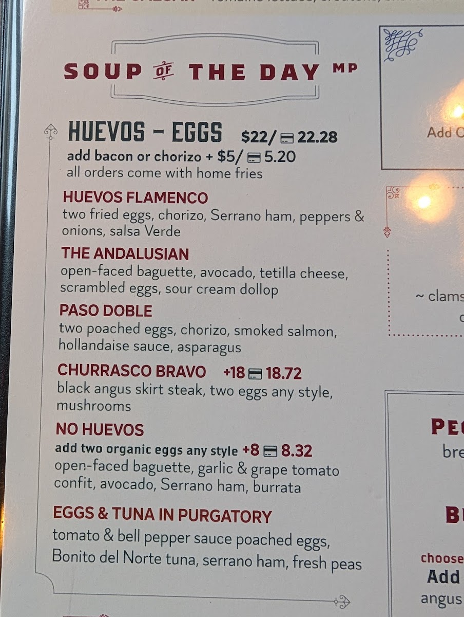 Two fried eggs, chorizo, serrano ham, peppers & onions, manchego-truffle fries, salsa Verde.