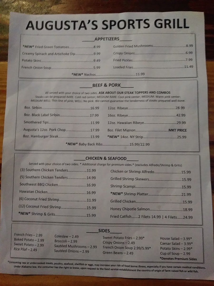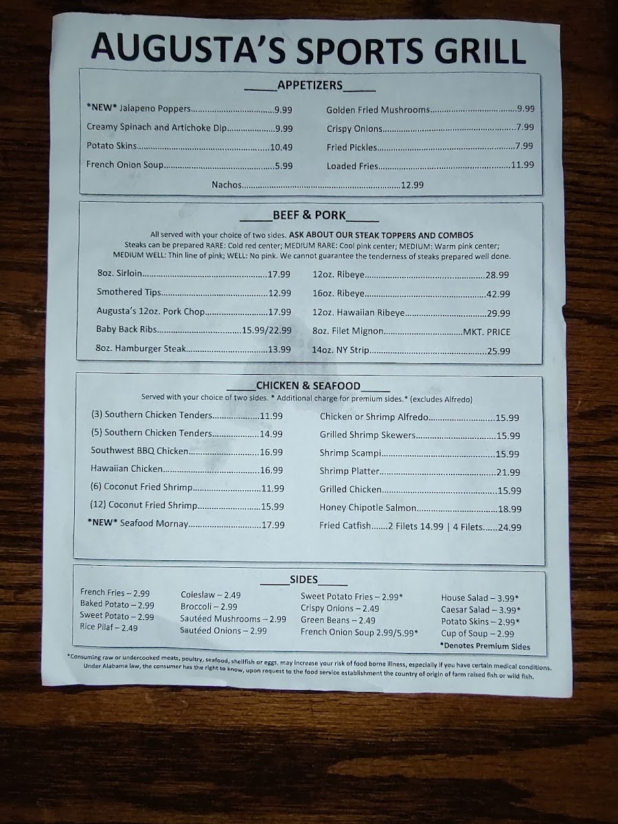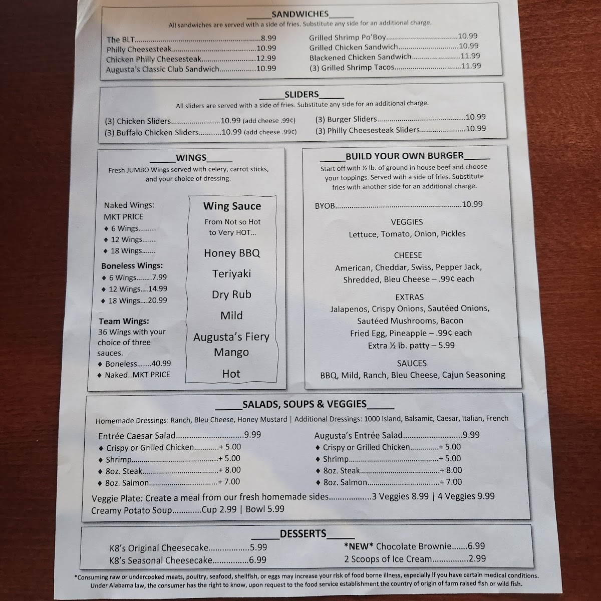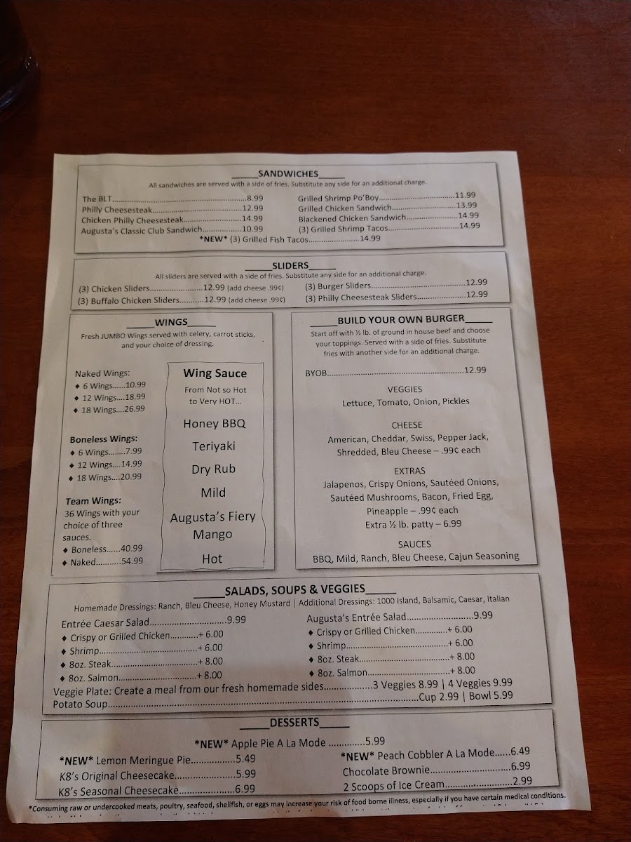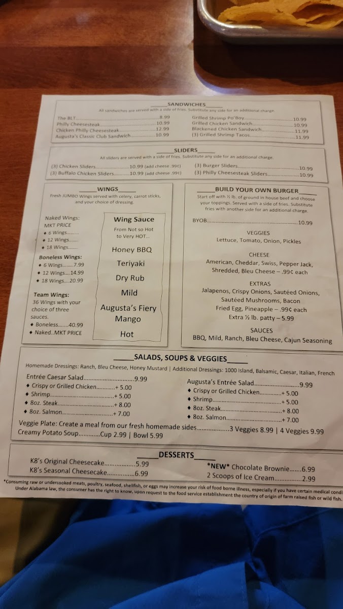 Boneless chicken wings. Choose from various dipping sauces like Bleu Cheese, Honey Mustard, and BBQ. Wing sauces include options like Teriyaki, Lemon Pepper, and Augusta's Fiery Mango.