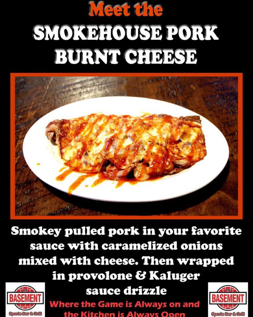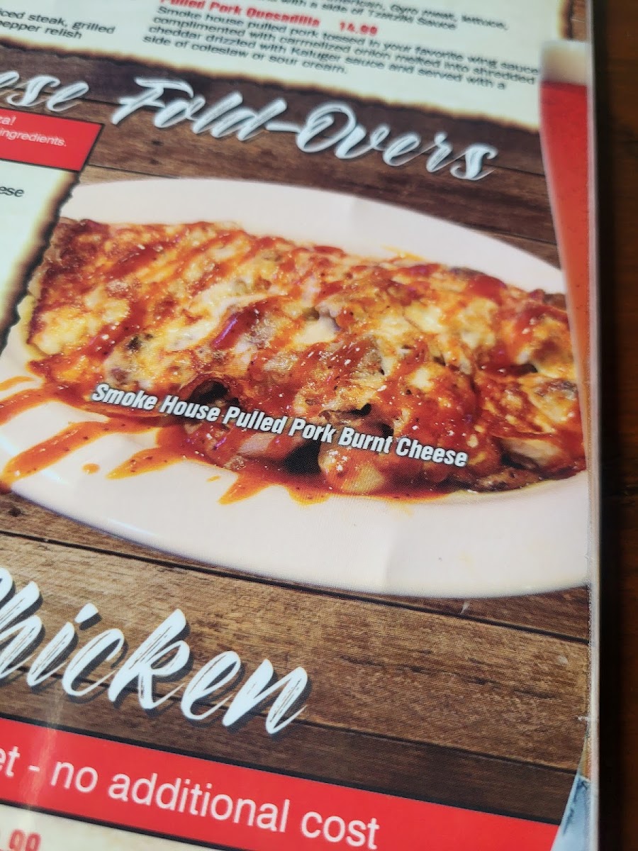 Choose your favorite wing sauce with pulled pork, cheddar and white American cheeses, caramelized onion with a Kaluger drizzle and served with pico & choice coleslaw or sour cream