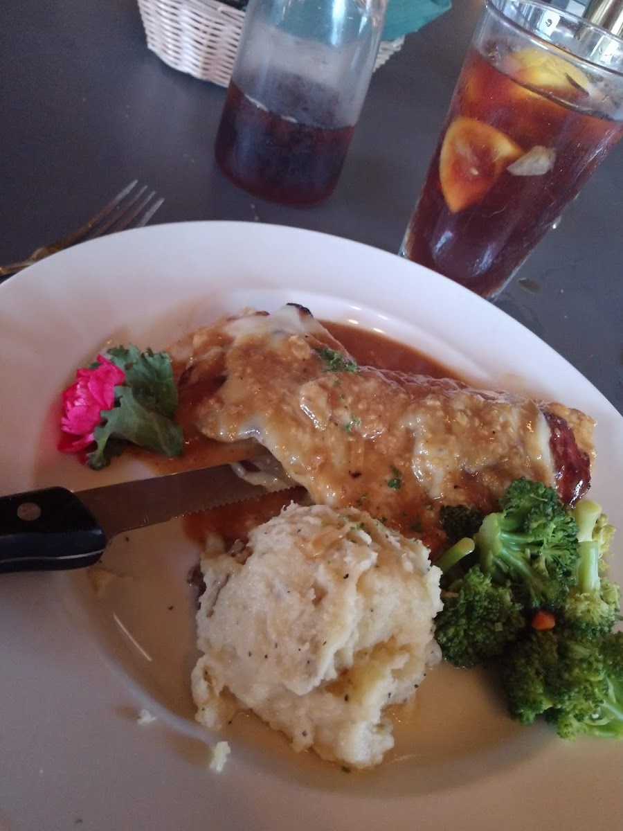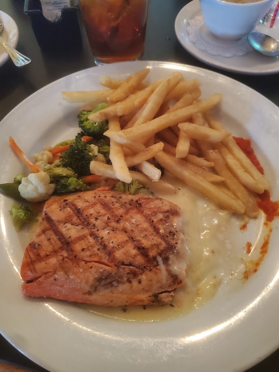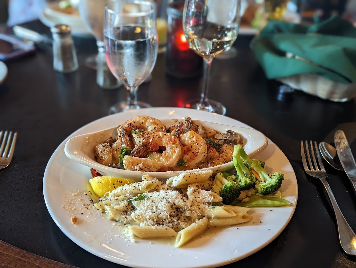 Place is visually deceptive. Kind of janky looking outside but very niceand comfortable inside. Service is prompt and friendly. Food was very good. Friends liked their steaks and prime rib and my wifes and mine pasta choices were tasty. Her chicken linguini ahe loved. My shrimp with angel hair pasta had lots of small shrimp and the seasoning was properly resrained and not overly garlic. One issue was that angel hair is a tricky pasta to handle. Mine was way overdone. I think they cooked the pasta to doneness but did't take into account the hot shrimp and sauce cooked it more. The creme brule' was too cold and in a too deep ramikin. Taste was good but but not served properly. The mens restroom looked like it was painted by a teenager on adderall.