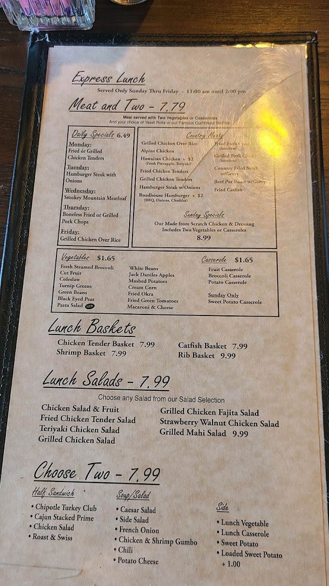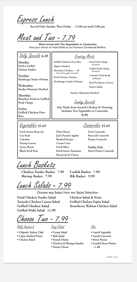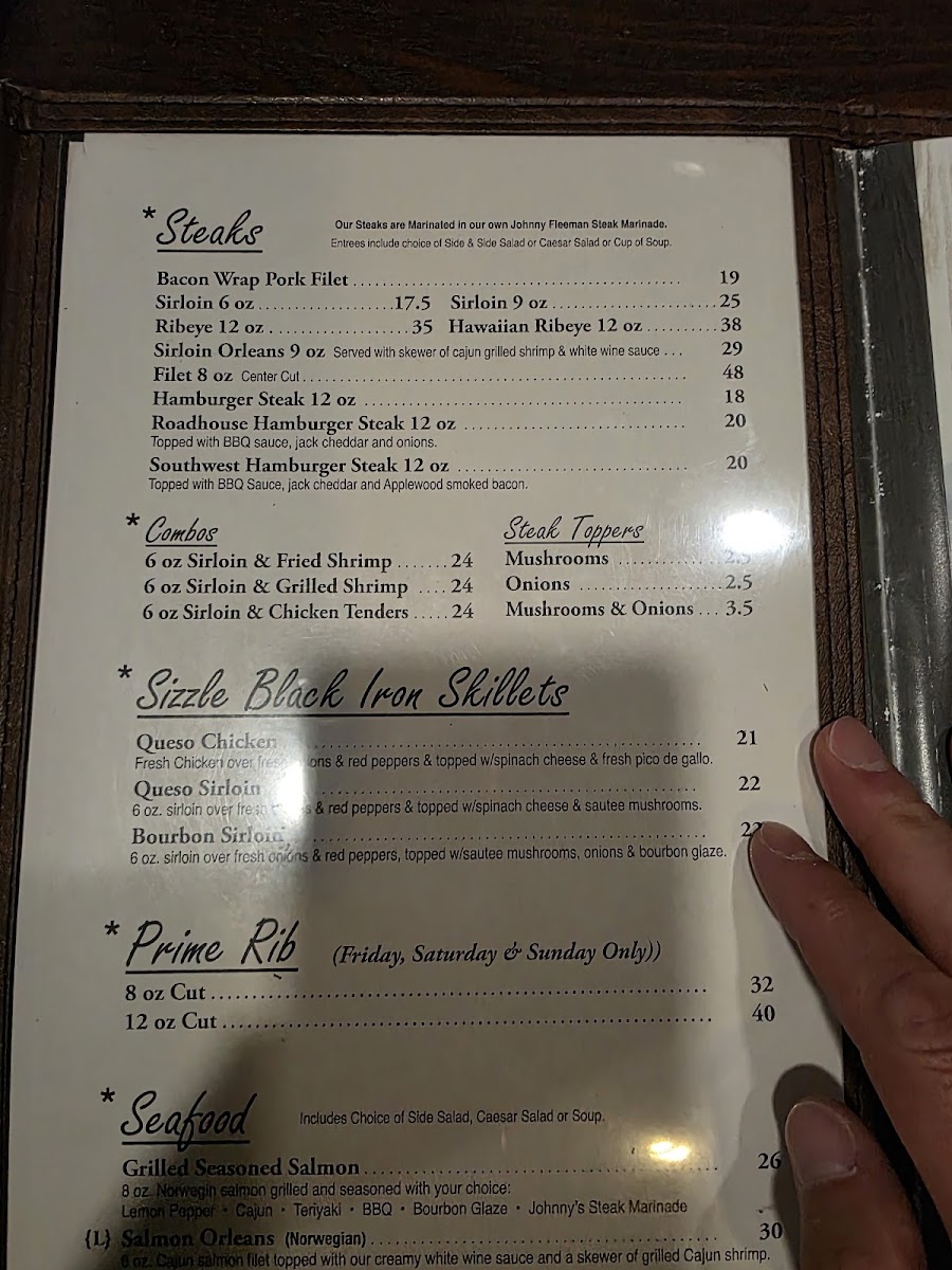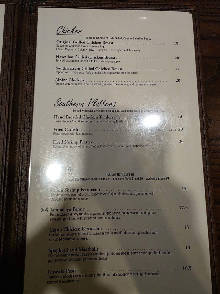 2 grilled shrimp skewers (10 shrimp) Choice of seasoning Johnny’s Marinade • Lemon Pepper • Cajun • Teriyaki • Bourbon Glaze. Served with 2 sides.