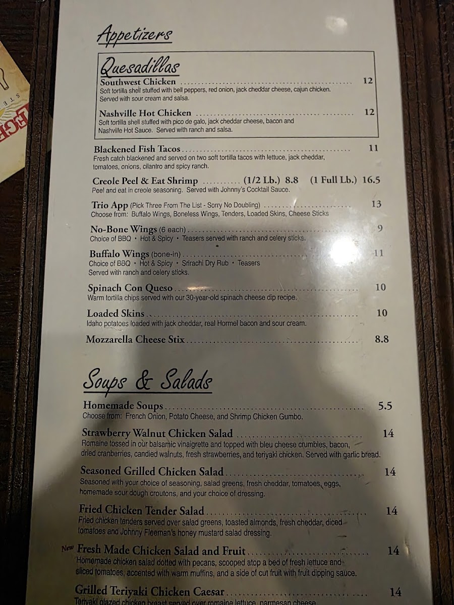 Salad greens, fresh cheddar, tomatoes, egg, croutons, & grilled chicken. Seasonings: Cajun • Lemon Pepper • Johnny’s Marinate • Teriyaki Sauce.