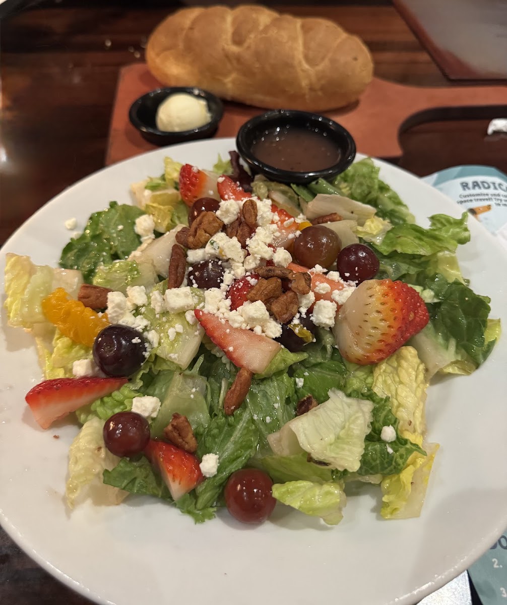 My steak was cooked ok but arrived lukewarm, which means it sat on the "window under light". Baked potato & salad were delicious. But I'll be hesitant to return. Because we went to eat a steak ( porterhouse) & both of us were disappointed The server was friendly & did her job but the tip was pretty high. $25 tip to pay for a lunch is pretty pricy.