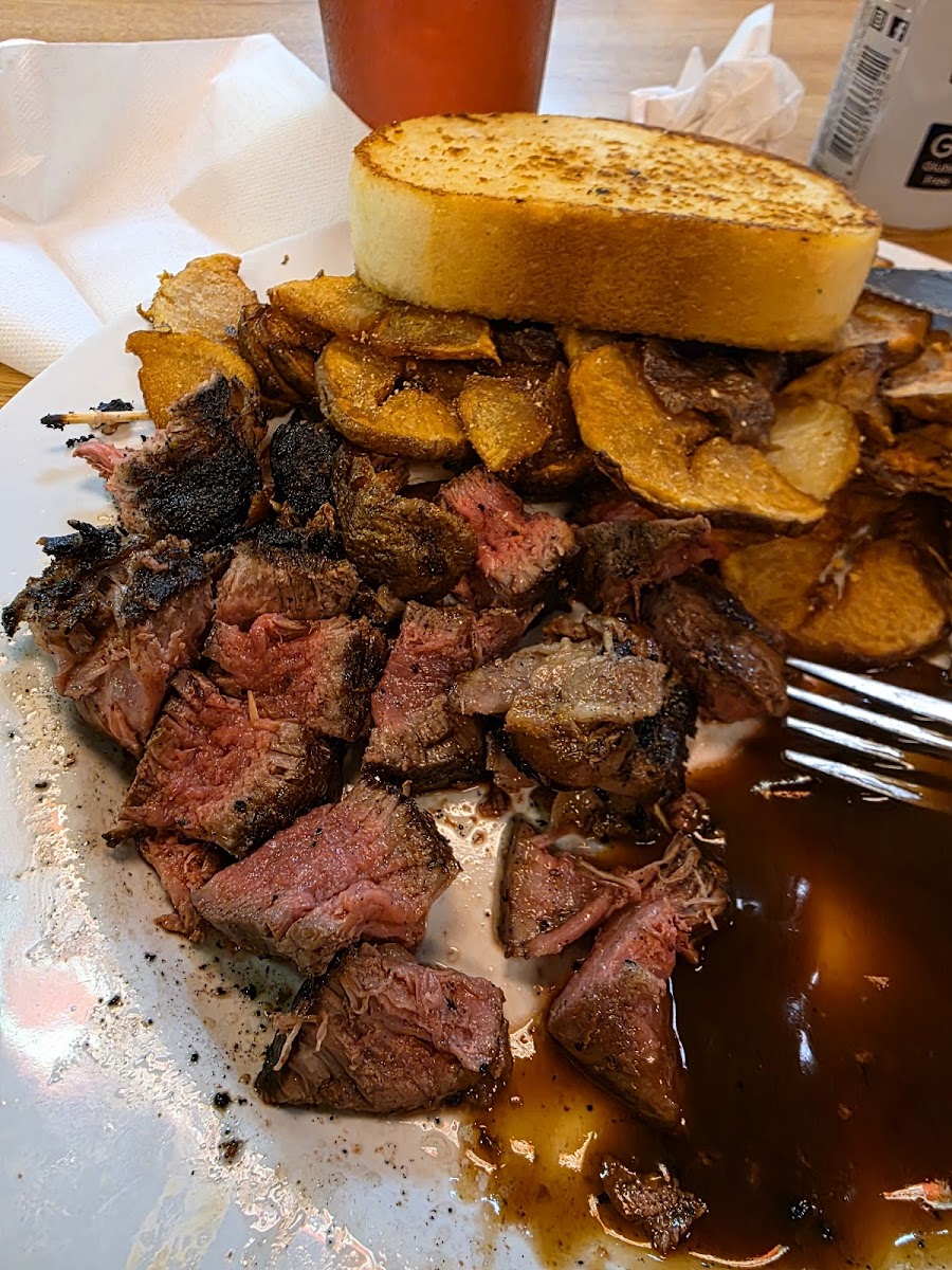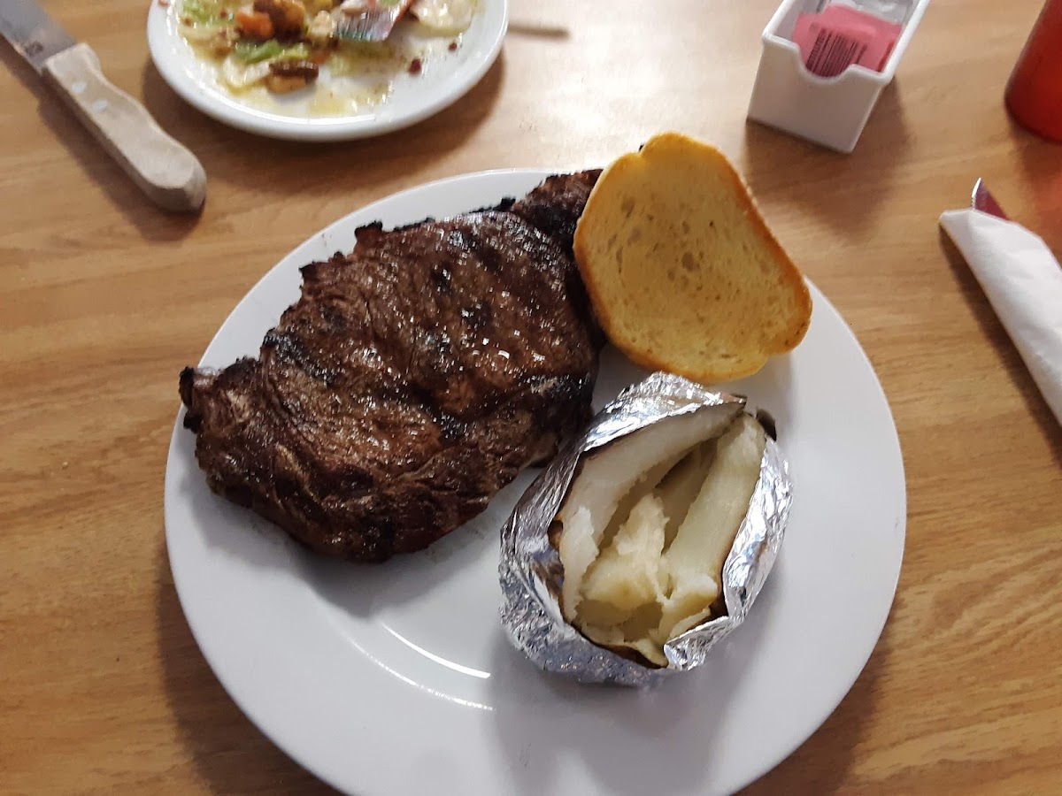 A really home style locals place that is well outside of town but worth the drive. Great steak, which is obviously locally grown, very good baked potato, enh sort of salad bar but really good coleslaw that you dressed with your choice of dressing. Very homey locals oriented decor (don't get dressed up, you are more likely to see the next door farmer/rancher in work clothes than someone in duds) but the food is what it is about. We'd spent the last 10 days in "fishing country" with the best of that, but wanted a good steak; this was the place to get it! The homey atmosphere was perfect for what and where, but not something you would describe as "nice", the decor was fun to look at and fit for the rest of this restaurant that is in the back three-quarters of a quick-mart sort of filling station but a bit too loud and crowded for the two of us that are very hard of hearing. (Fortunately, we were there on a Sunday evening and it was pretty quite so we were VERY happy with the whole ambiance. Also, this review is a balance of full disclosure and foodie pleasure.) The wines are not sophisticated or what one might want in a good steak house and only listed by varietal; but when I asked barkeep what the reds were;Josh! We had both a Cab and Merlot, and both were quite good especially for the price. The whole deal was a 9.8 of 10!
