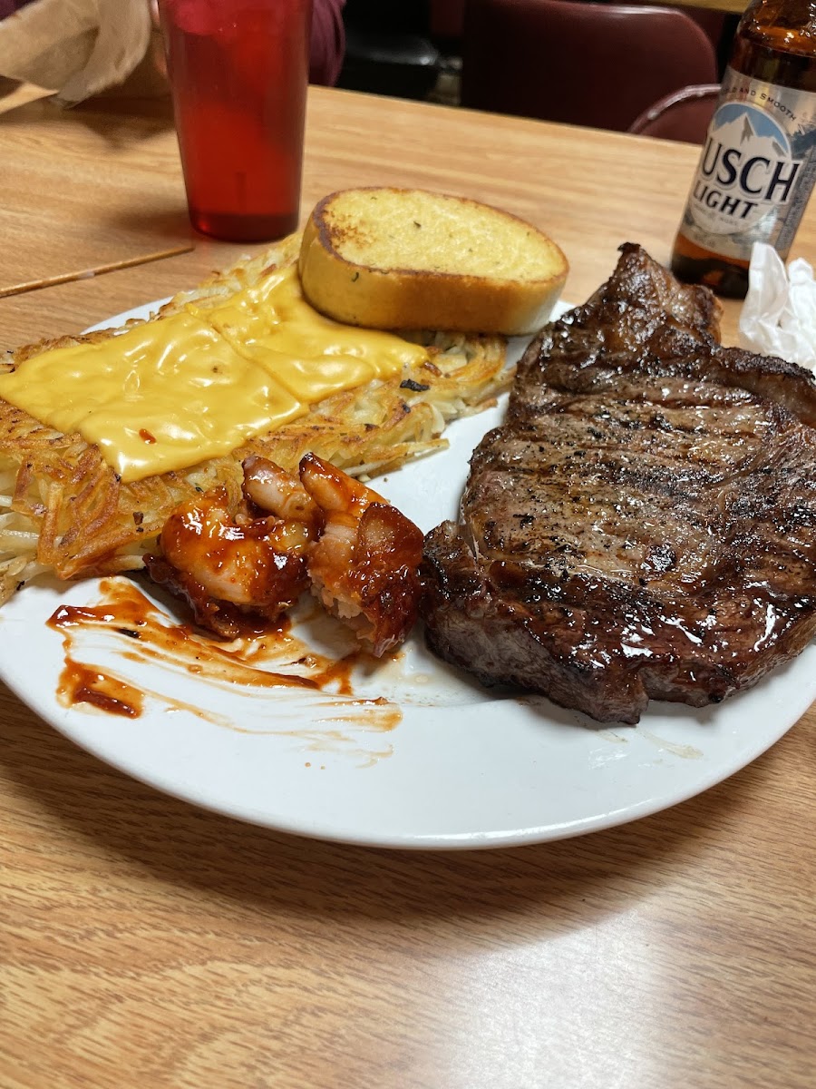 We stopped here, 830pm , could tell they had been busy, they took care of us , they do have a salad bar , ribeye, fish, chicken, deep fried mushrooms bacon wrapped BBQ shrimp