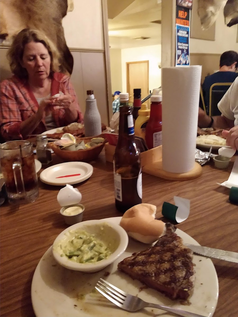 Well if you are looking for that interesting place that gives you a unique feeling of folksy Americana, this is it. One of the few places I have been that is so popular the parking lot is full of cars and of course a Harley and a Golf Cart! People come from all around to eat the food in this country bar and grill. The place was full, the waitstaff busy and everyone was happy, talking and sharing stories and the place had that buzz of conversation that you find in small places like this. While obviously a central meeting place for dining and libation in the small town of Vining, it is also interesting with the mix of corrugated tin roofing and taxidermy, (Elk, Deer, a Duck and what appeared to be a Badger) hanging on the walls. Look, if you are coming here for fine dining, forget it! If you want a very decent sized portion, in a folksy, friendly and interesting place, leave your tie at home and put on your baseball cap and or cowboy hat and mosey on in. Be willing to wait for some service if their busy and just enjoy the down home feeling of the place. Be patient and when your food comes, you'll be quite pleased. I had the 14 oz Rib eye, and it was delicious, char broiled and very tender. It was worth the wait. Lloyd (Stormy) Hall, Miltonvale, KS.