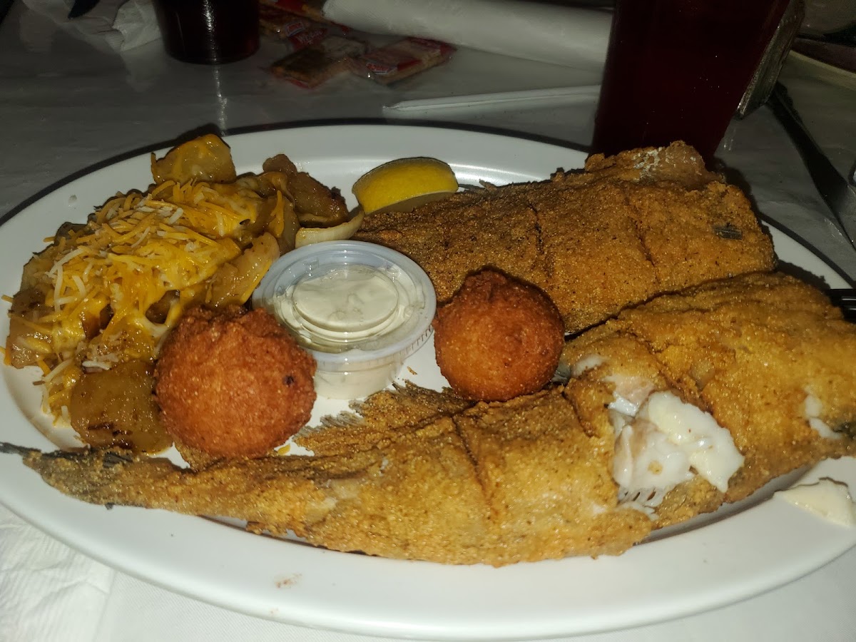 We had a group of just over 20. They accommodated us really well (we'd called ahead) Everyone had something different - from what I could tell. My hubby had the fish platter which was a LARGE portion and very good. I had crab cakes and a baked sweet potato. Other had fish or steak (heard that was a lil tough) Service was wonderful! Tracy was our waitress and was wonderful!!