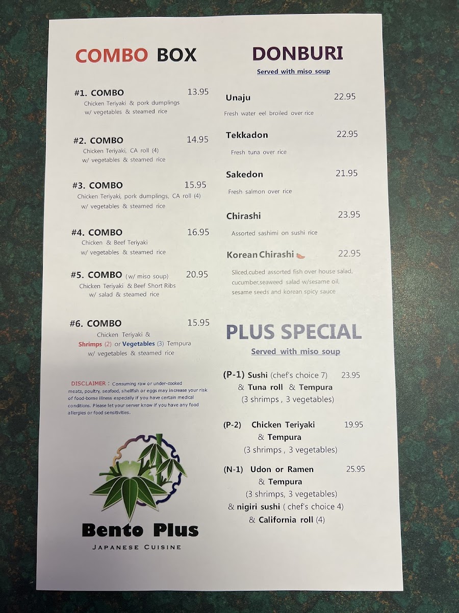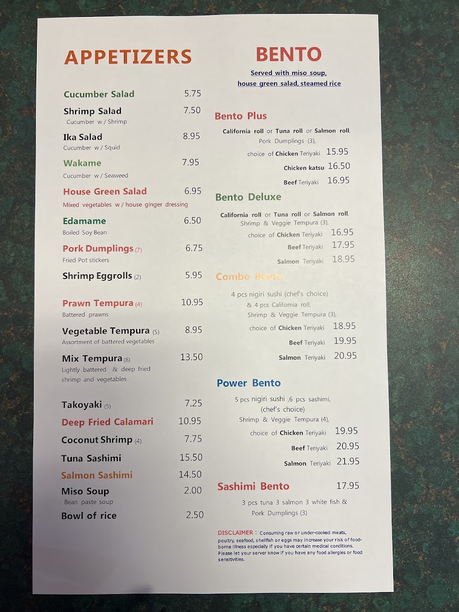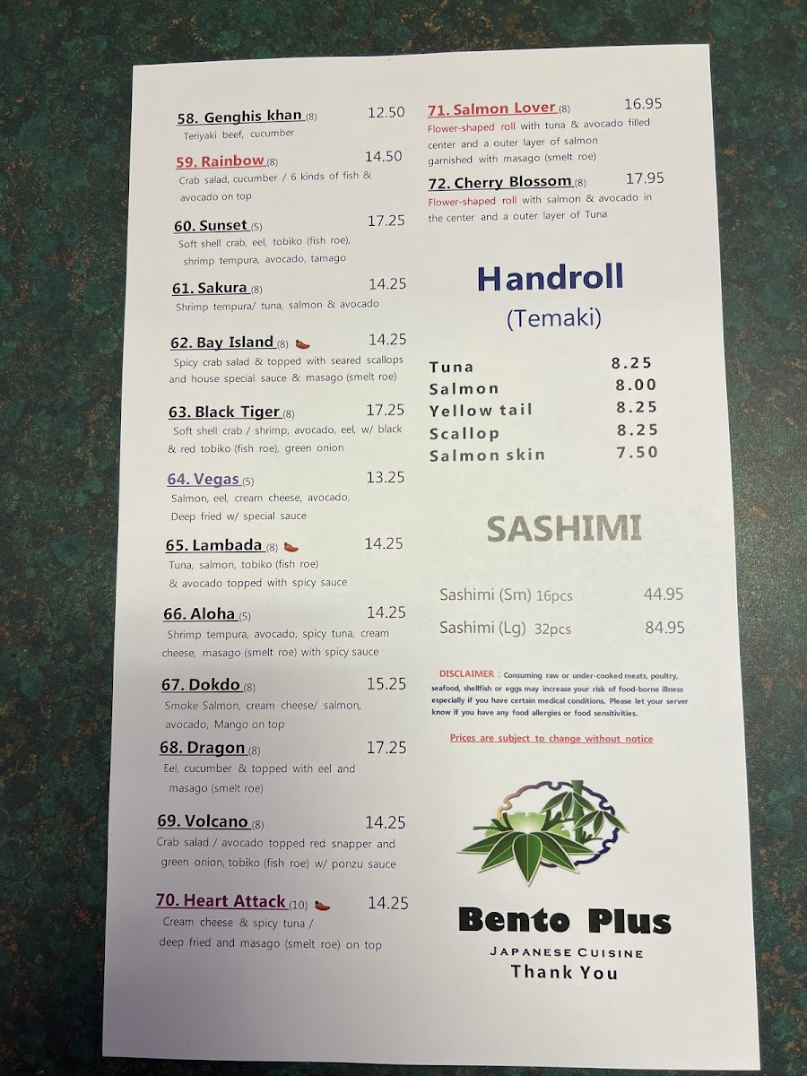 California roll or tuna roll or salmon roll, shrimp and veggie tempura (3 PCS.), choice of chicken, beef teriyaki