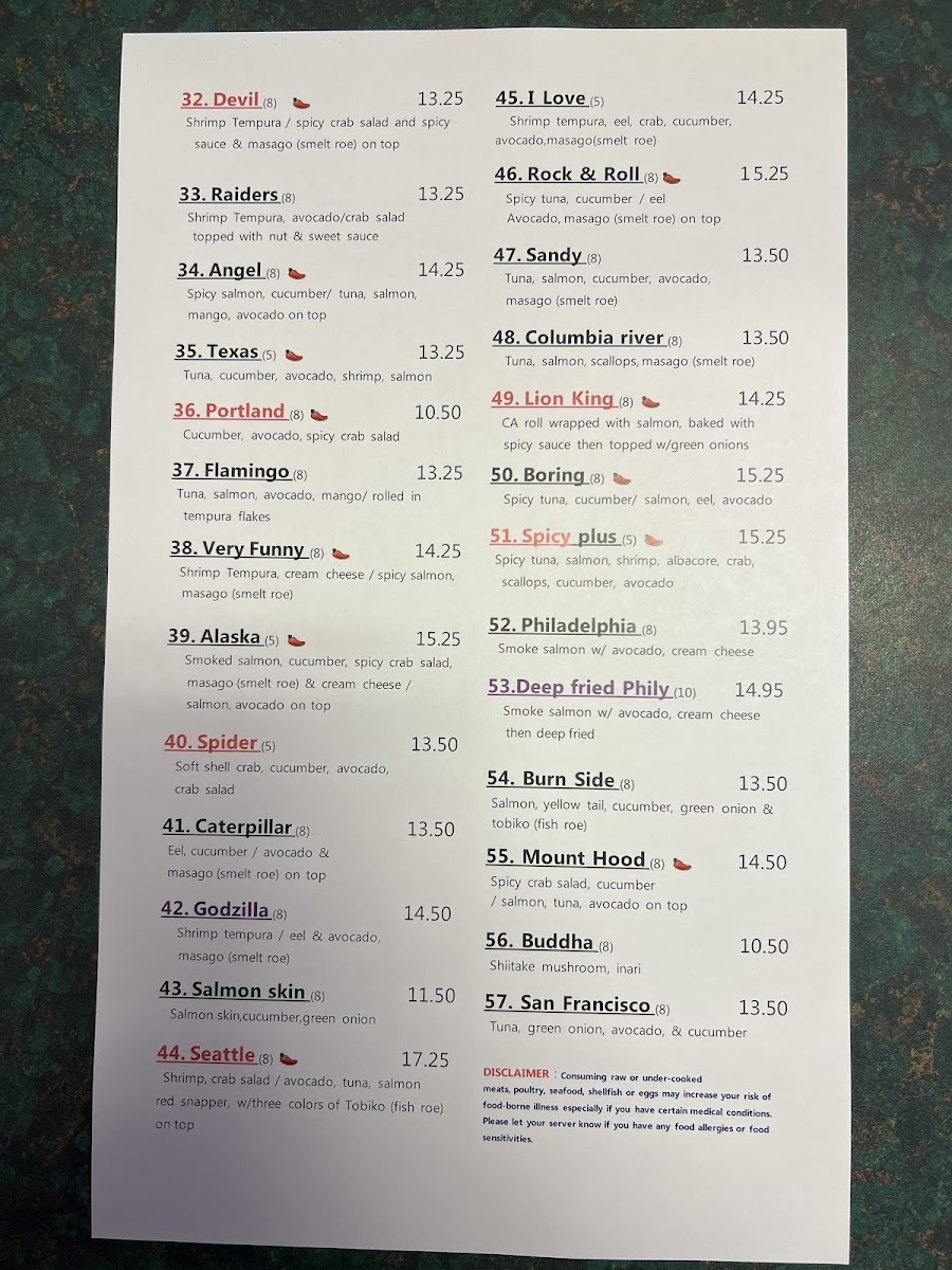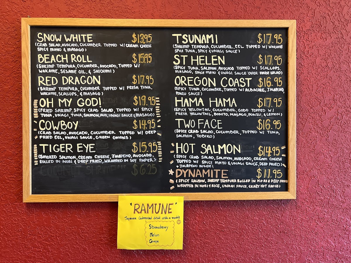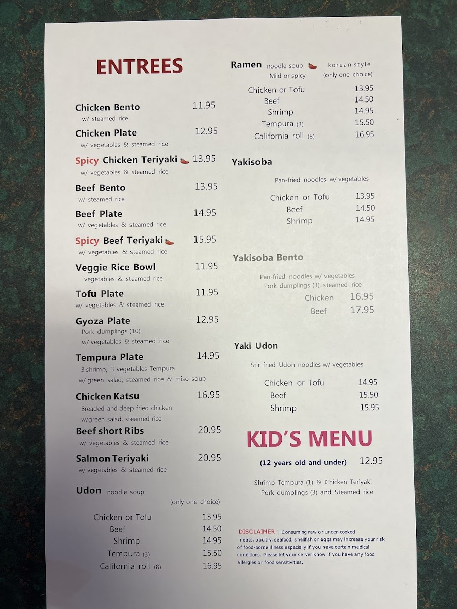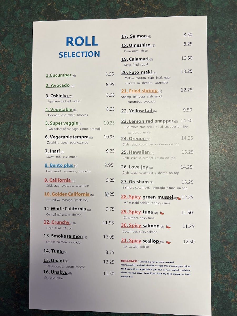 California roll or tuna roll or salmon roll, shrimp and veggie tempura (3 PCS.), choice of chicken, beef teriyaki