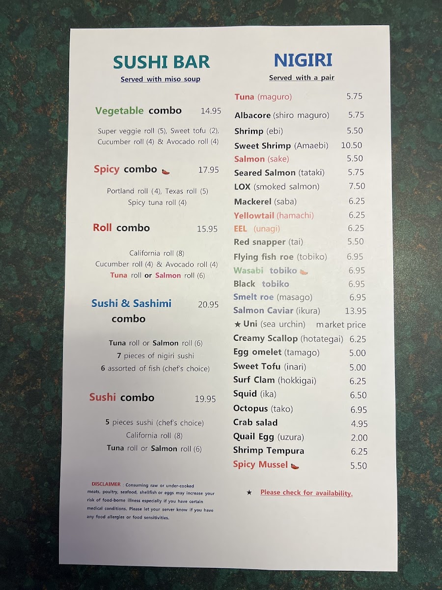 3 shrimps, 3 vegetables and nigiri sushi (chef's choice 4) and California roll (4).
