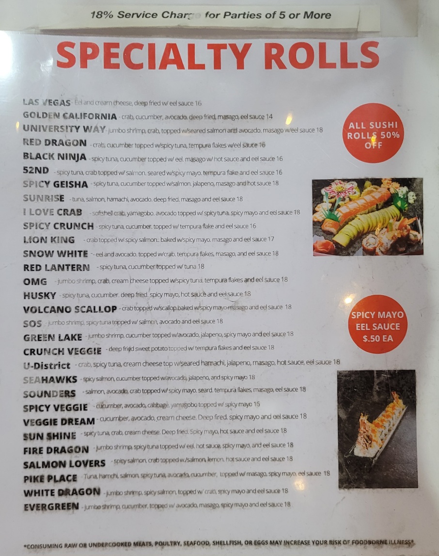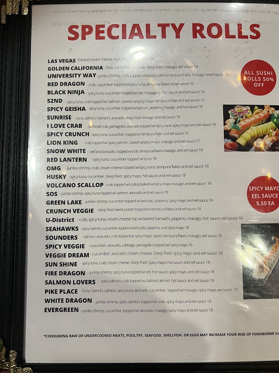 Spicy tuna, crab, cream cheese, topped with seared yellowtail, jalapeno, fish eggs, spicy sauce, eel sauce