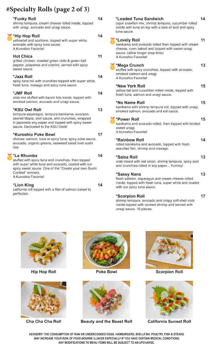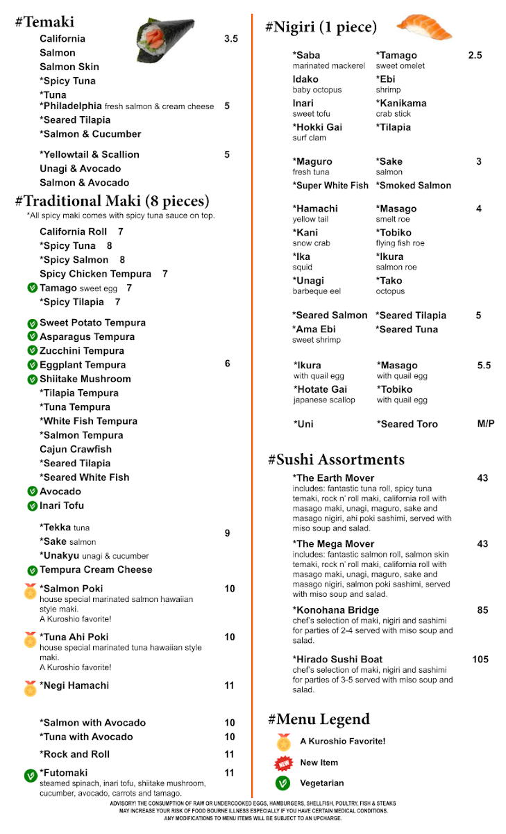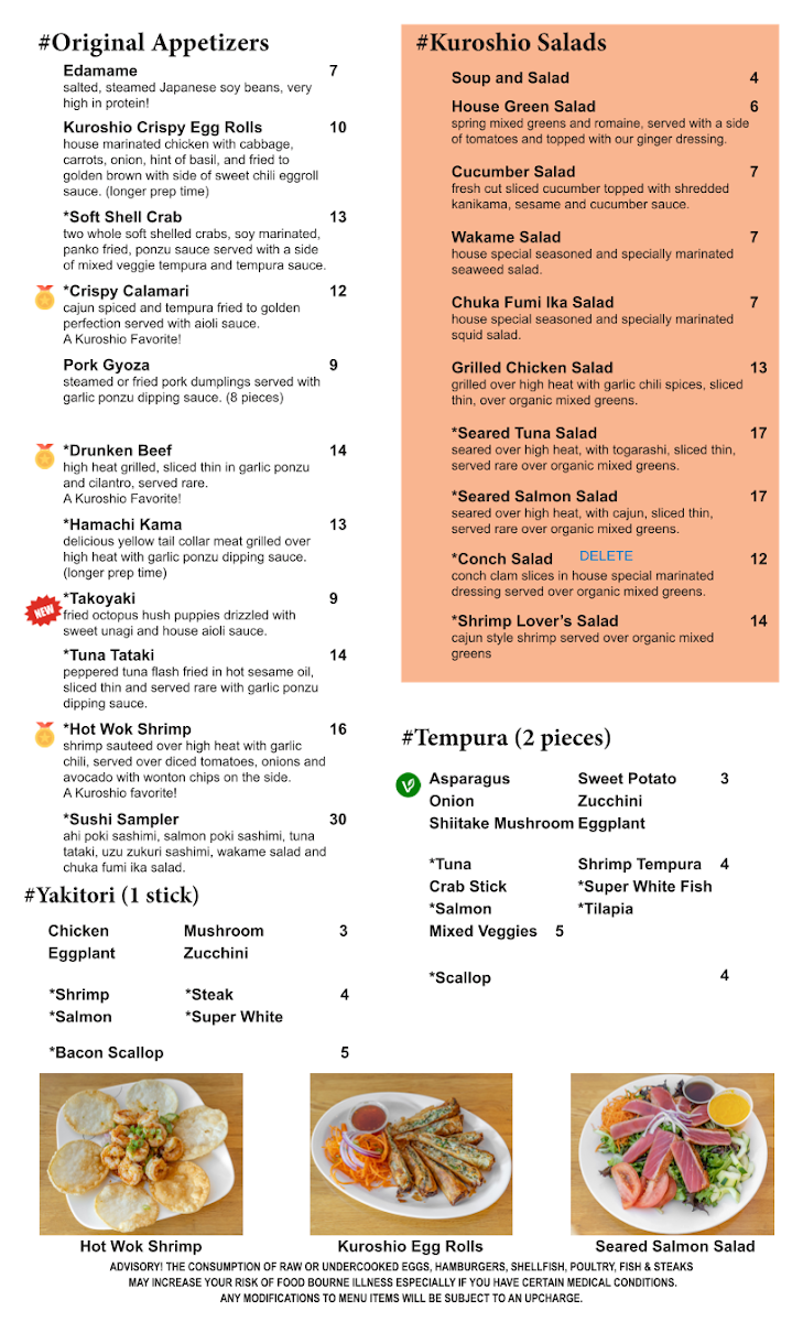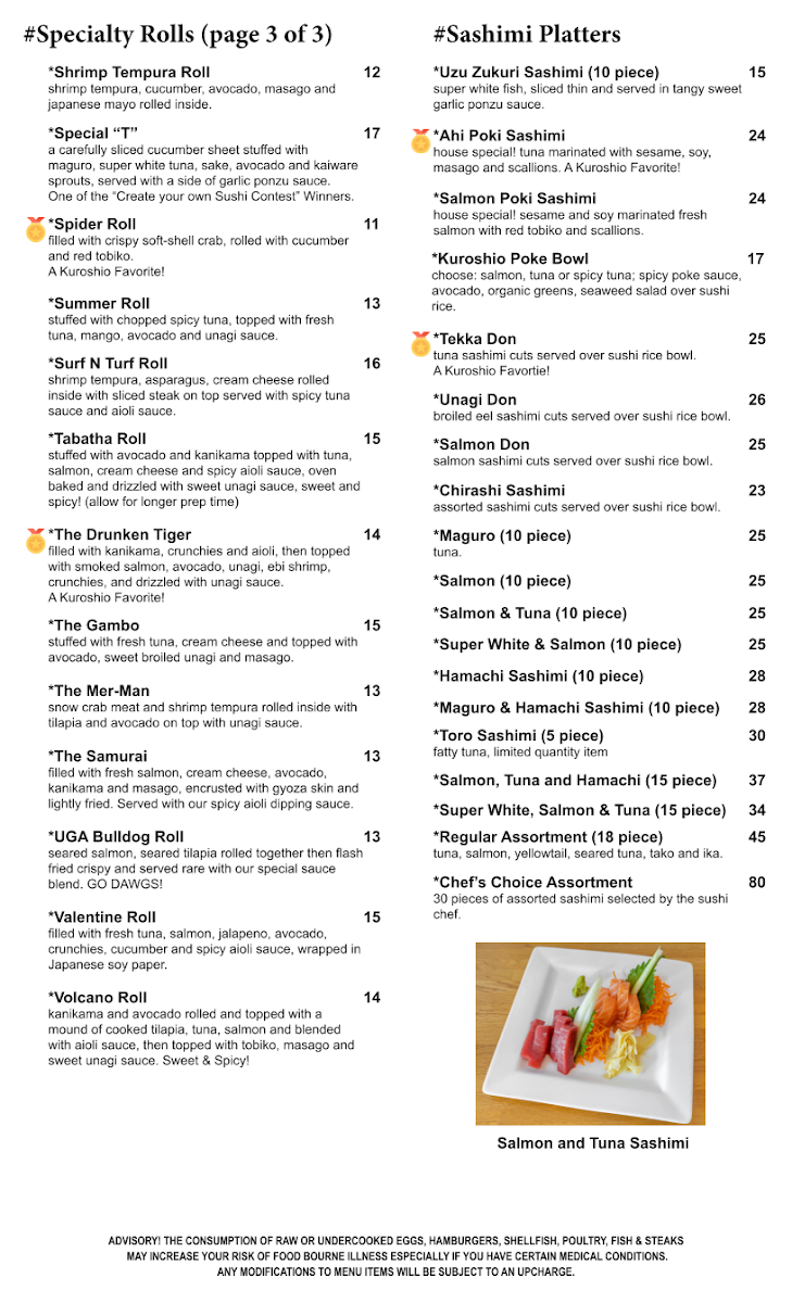 The consumption of raw or undercooked eggs, hamburgers, shellfish, poultry, fish & steaks may increase your risk of foodborne illness especially if you have certain medical conditions any modifications to menu items will be subject to an upcharge. Tuna, salmon, yellowtail, seared tuna, tako, ika.