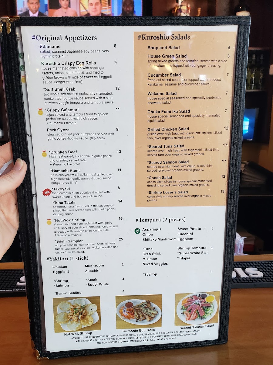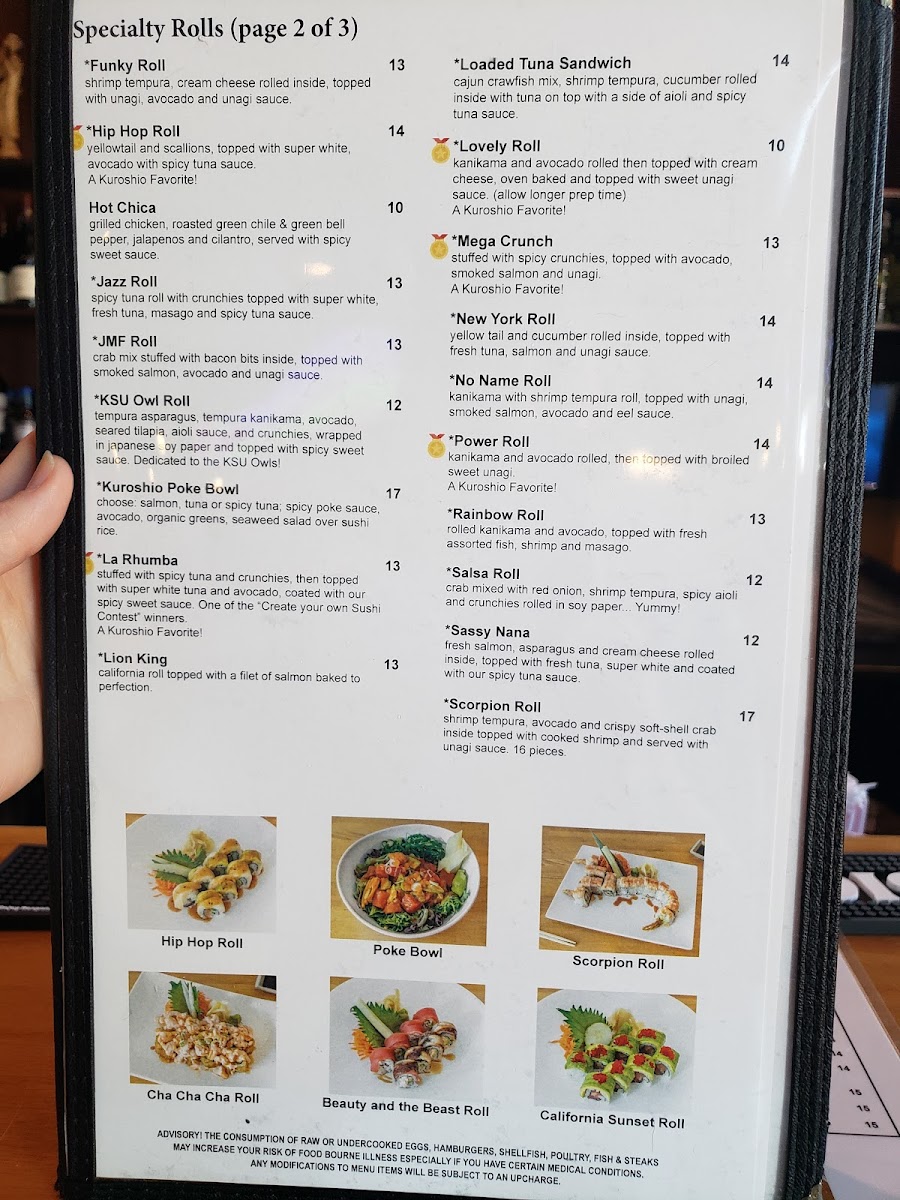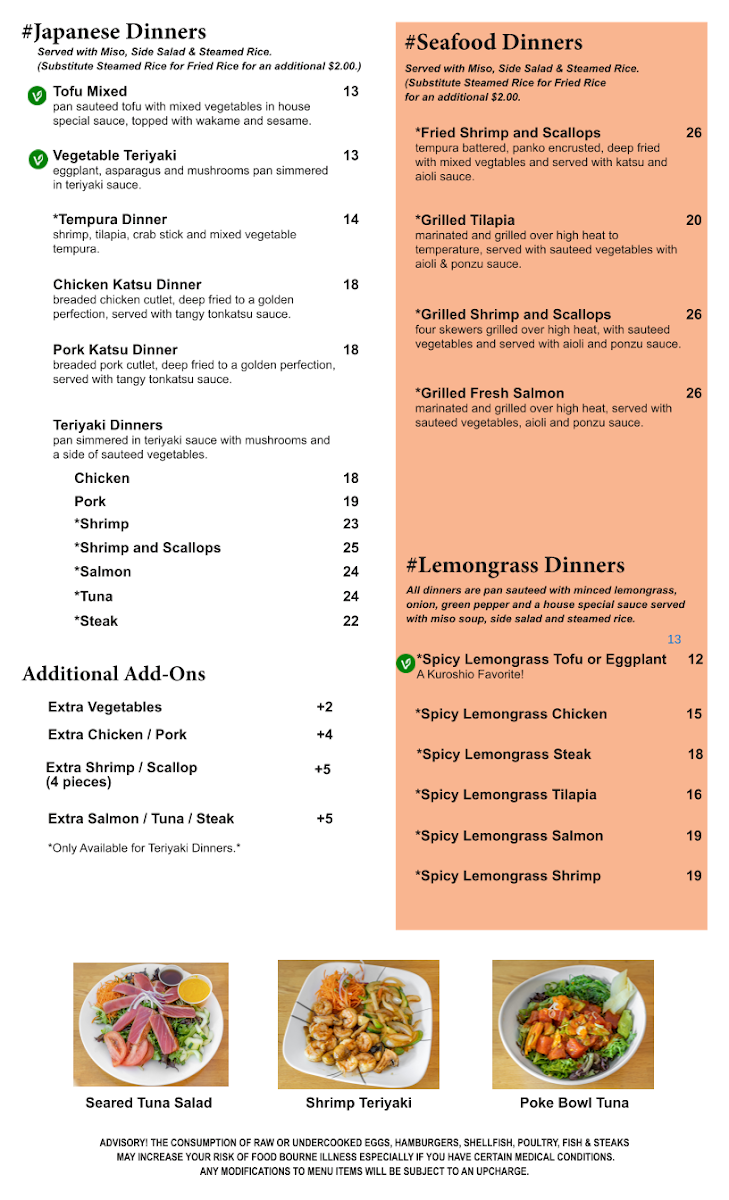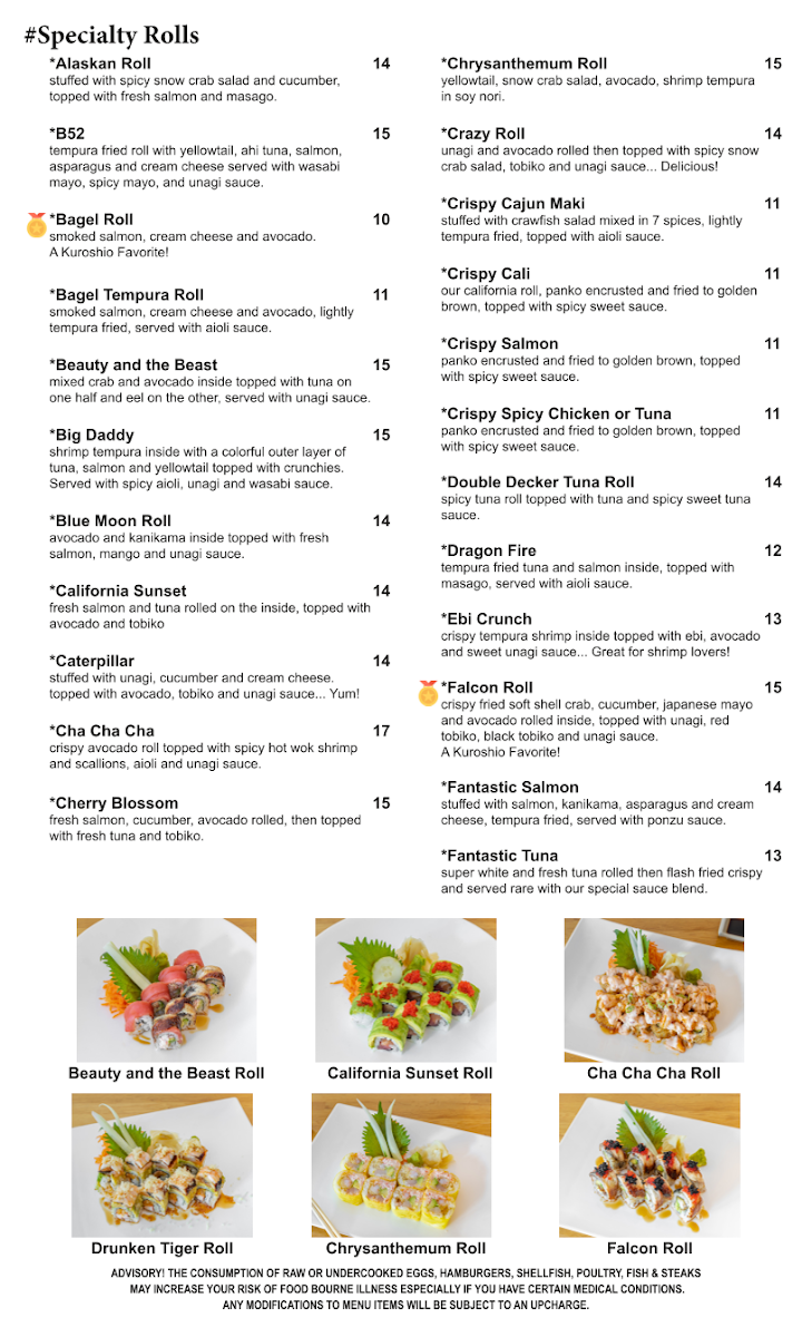 The consumption of raw or undercooked eggs, hamburgers, shellfish, poultry, fish & steaks may increase your risk of foodborne illness especially if you have certain medical conditions any modifications to menu items will be subject to an upcharge. Tuna, salmon, yellowtail, seared tuna, tako, ika.