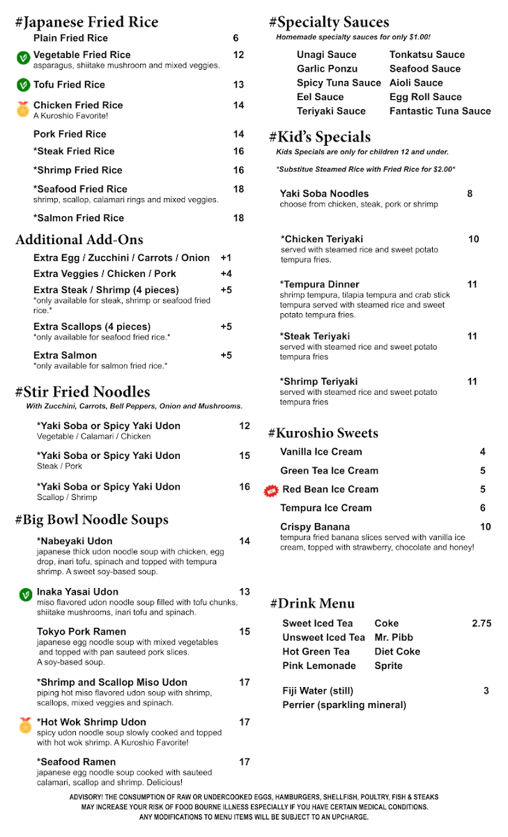 The consumption of raw or undercooked eggs, hamburgers, shellfish, poultry, fish & steaks may increase your risk of foodborne illness especially if you have certain medical conditions any modifications to menu items will be subject to an upcharge. Japanese thick udon noodles soup with chicken, egg drop, inari tofu, spinach, topped w/tempura shrimp. a sweet soy-based soup.