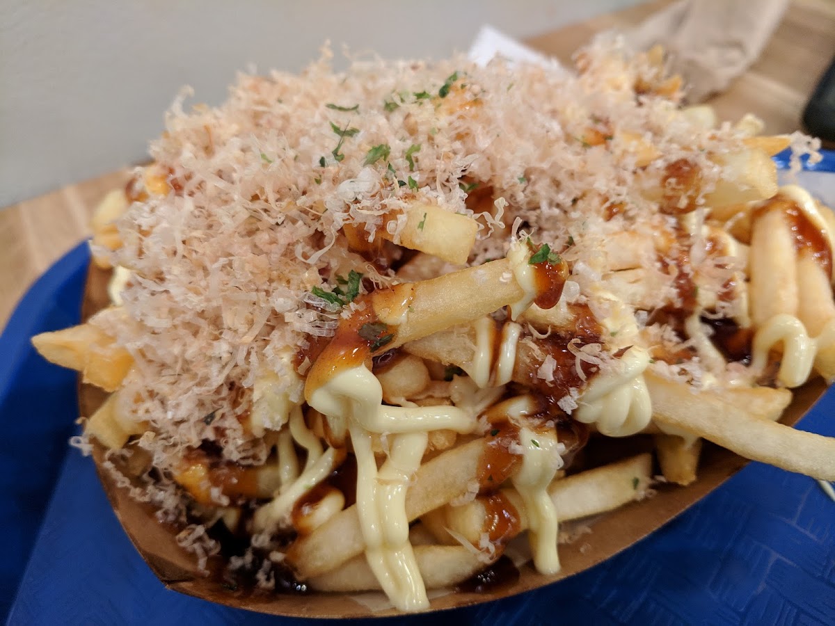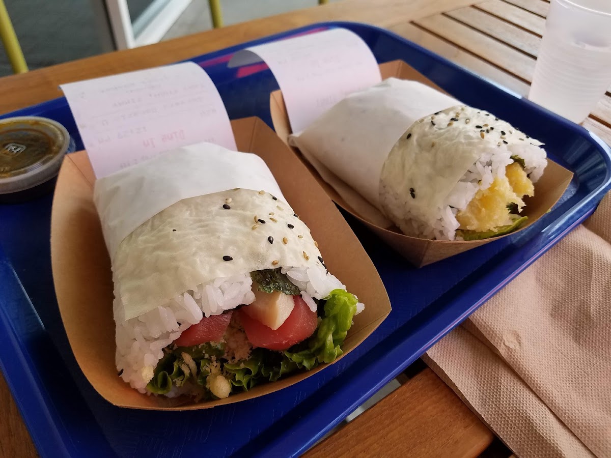 Really like the flavor combinations of the mango one and the red dragon. Just wish they put the sauce throughout the pocket instead just at the bottom. One is pretty filling. The build-your-own 2 protein doesn't say, but it comes with crab meat. Husband likes the Osaka fries because they remind him of okonomiyaki (sauce and benito flakes). Everything travels well if you order it to go.