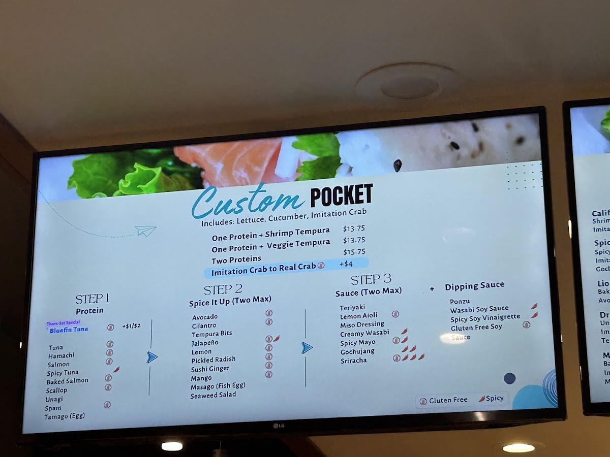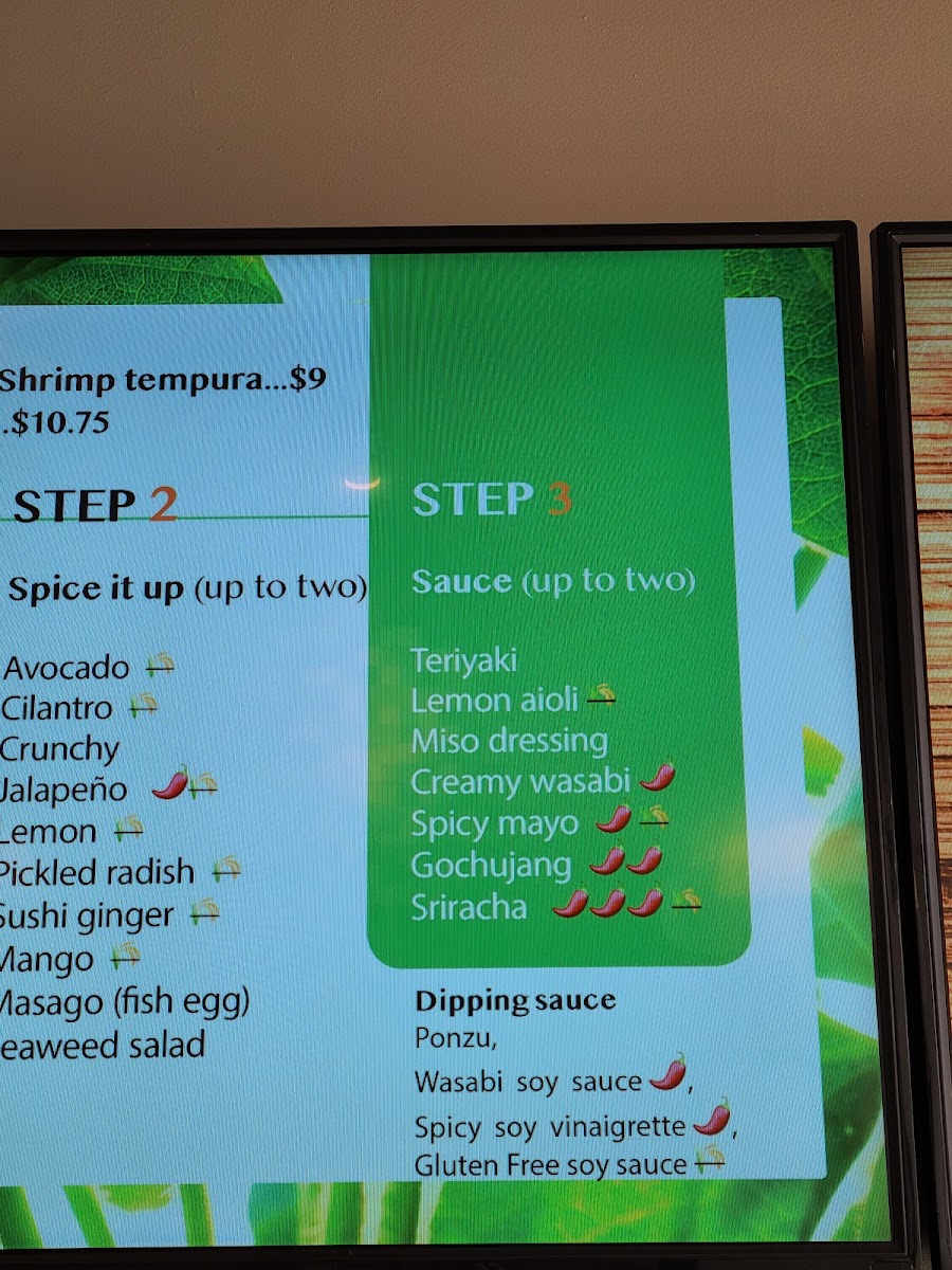 Lettuce, Cucumber, Spicy Tuna, Tempura Shrimp, Unagi, Avocado, Teriyaki, Spicy Mayo