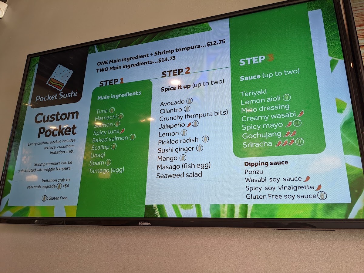 Lettuce, Cucumber, Imitation crab, tempura shrimp, Unagi, Avocado, Teriyaki