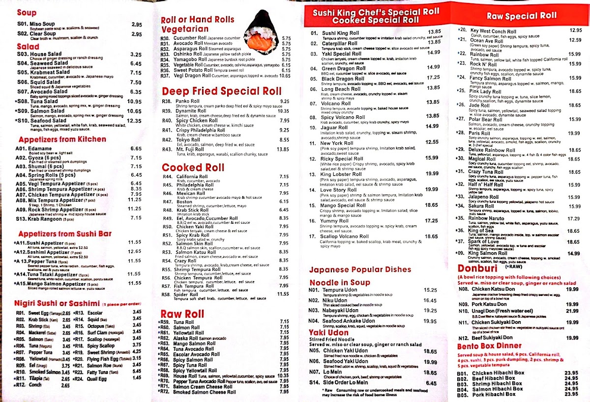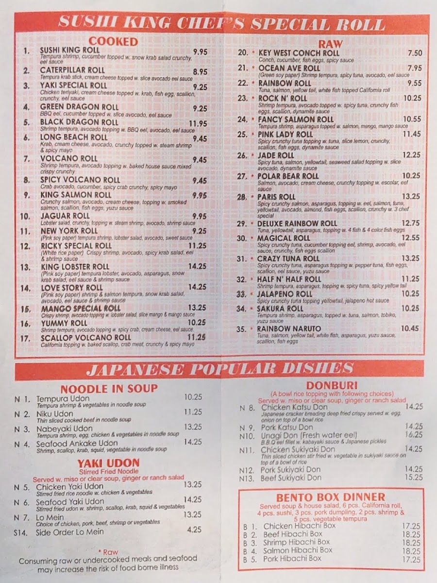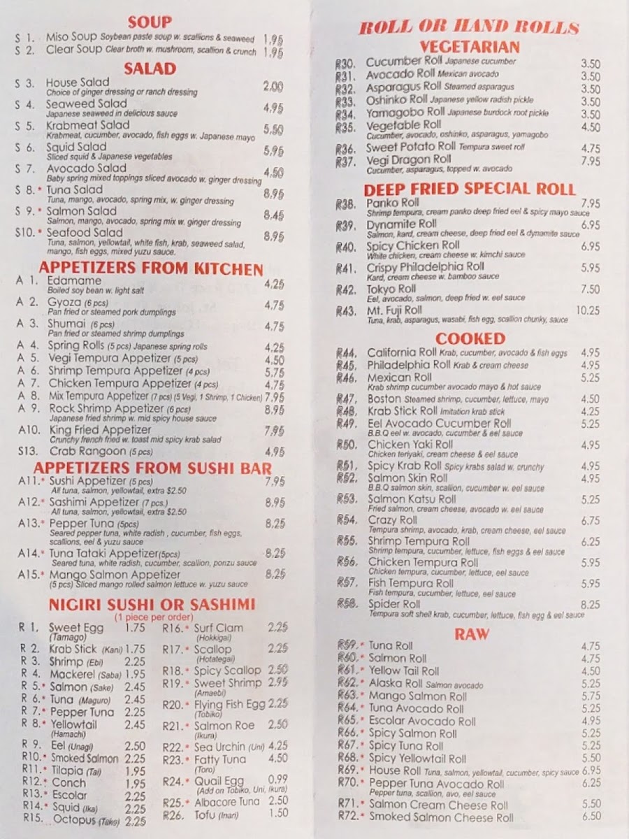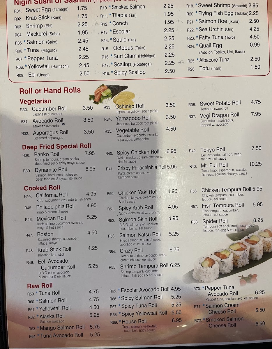 Additional charge for all tuna, salmon or yellowtail. Consuming raw or undercooked meats and seafood may increase the risk of foodborne illness.