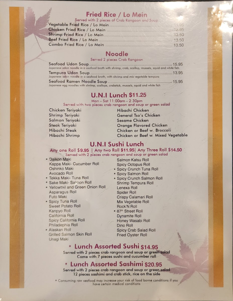 Contains mango, crab stick, avocado inside, topped with tuna, salmon, drizzling yzu aioli, eel sauce and masago.