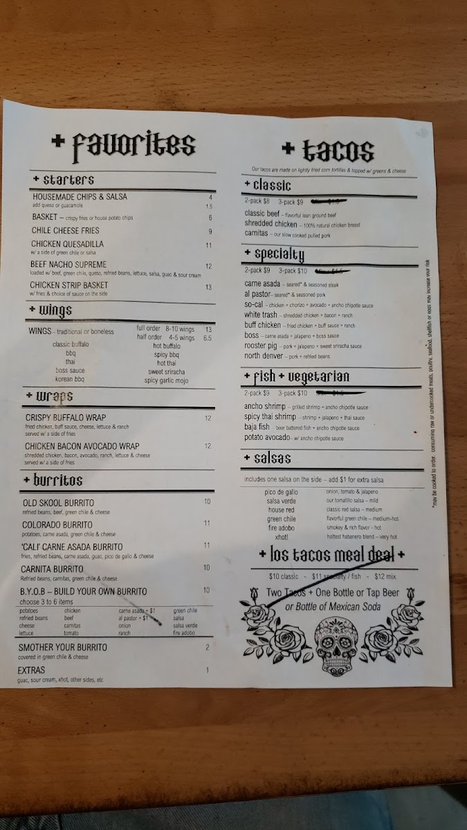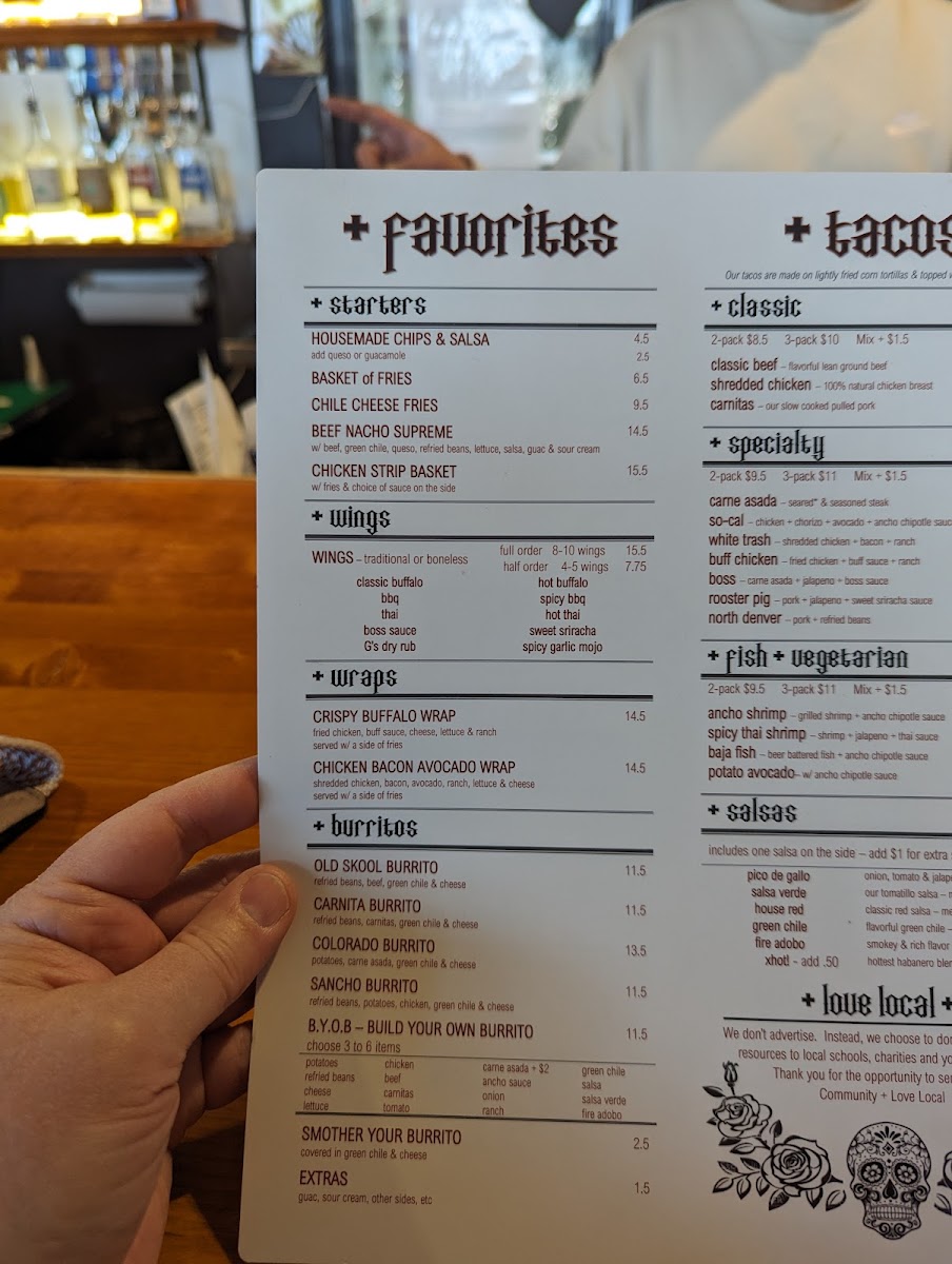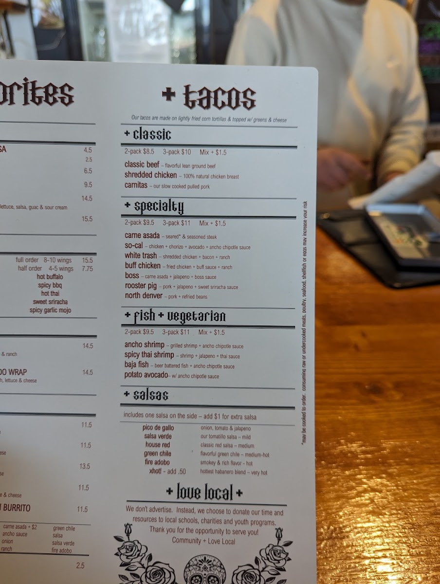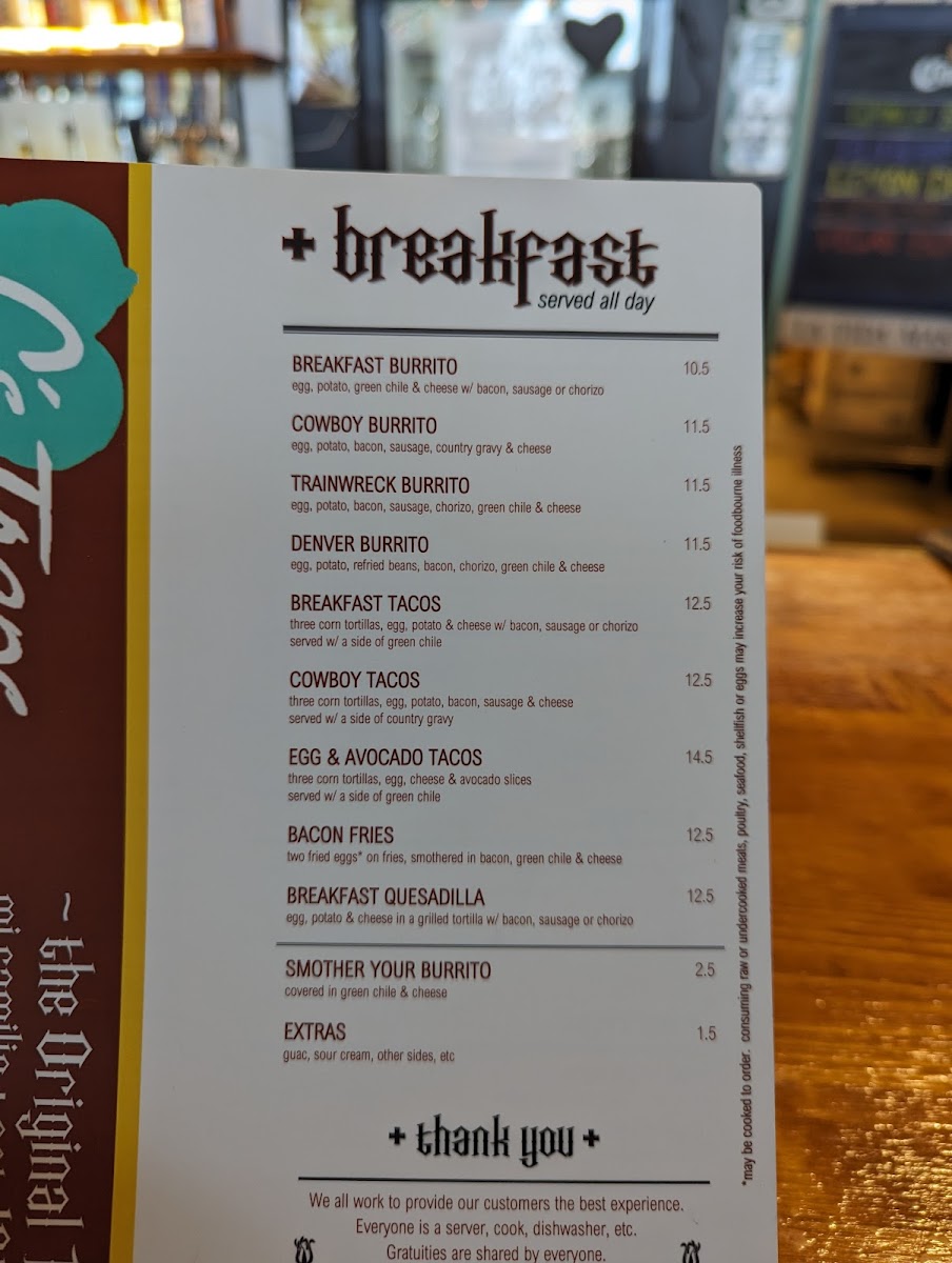 3 corn tortillas, egg, potato and cheese with bacon, sausage or chorizo served with a side of green chile.