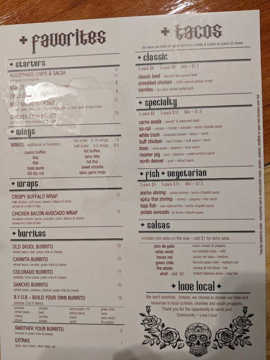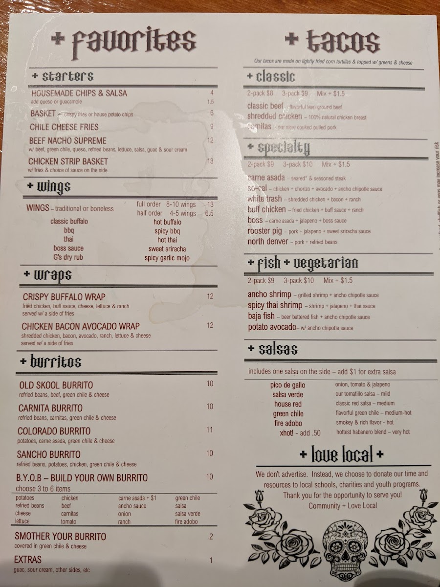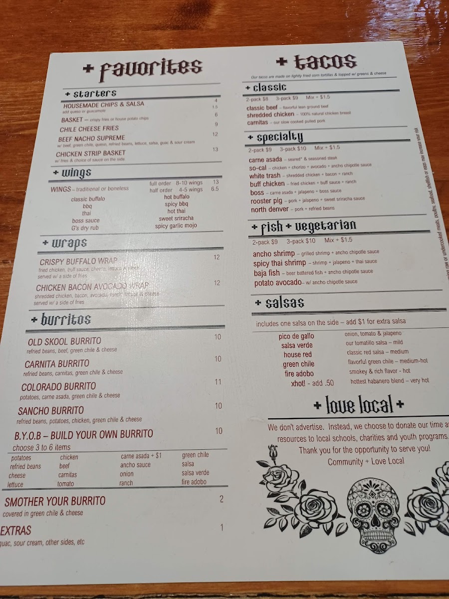 Egg, potato, bacon, sausage, country gravy and cheese. Smother your burrito (covered in green chile and cheese) for an additional charge.