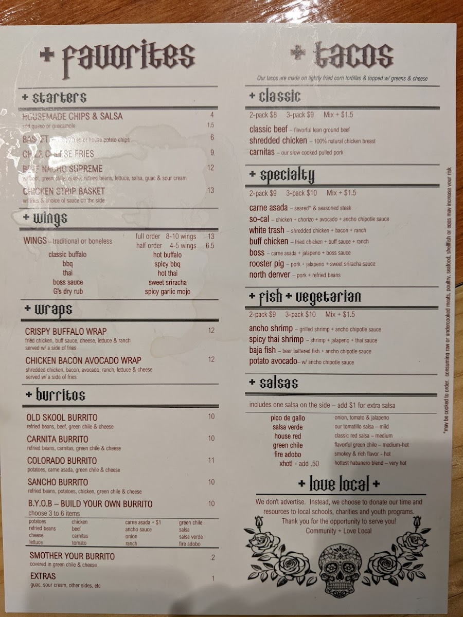 Egg, potato, green chile and cheese with bacon, sausage or chorizo. Smother your burrito (covered in green chile and cheese) for an additional charge.