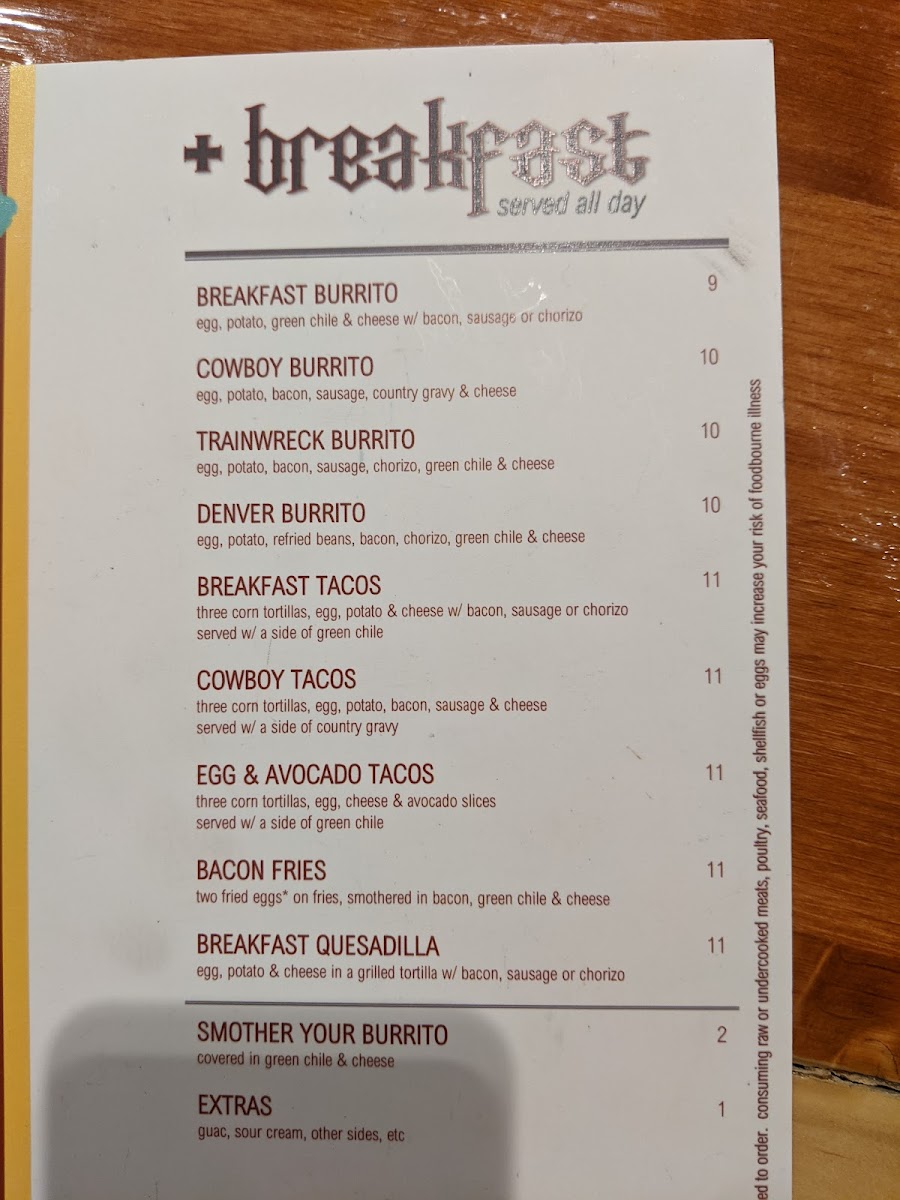 Egg, potato, bacon, sausage, chorizo, green chile and cheese. Smother your burrito (covered in green chile and cheese) for an additional charge.