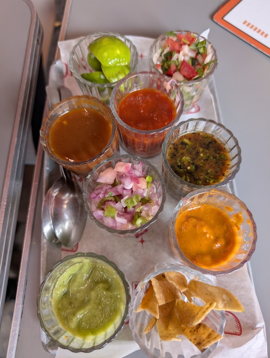 Stopped by for NYE dinner with most places closed, happy we did! We ordered margaritas and a selection of food. We originally ordered too much, which the waiter was polite enough to flag to me! Hostess was lovely and on the ball. We had to order a bottle of water twice and it still wasn’t received, but they were quick with the margaritas! Haha Food - Ordered some different tacos / tostadas and alambres. The Alambres was lovely, I’ve not had these before. Steak with peppers, onions and cheese and served with 6 tortillas. The short rib tostada was really good too! The meat was so tender and flavoursome. Rating based on the type of food venue it is - This is not fancy dining, more of a casual and quick eatery, but I already asked my husband if we can go back again before leaving CDMX! Fantastic value for great food. We also enjoyed the selection of salsas and sauces you get, each one was really good and different! Atmosphere - nice to see an open kitchen, we were on a table for two on the pavement which meant we had people passing and hovering while they waited for a free table which wasn’t ideal, but if you go knowing this it shouldn’t be an issue!