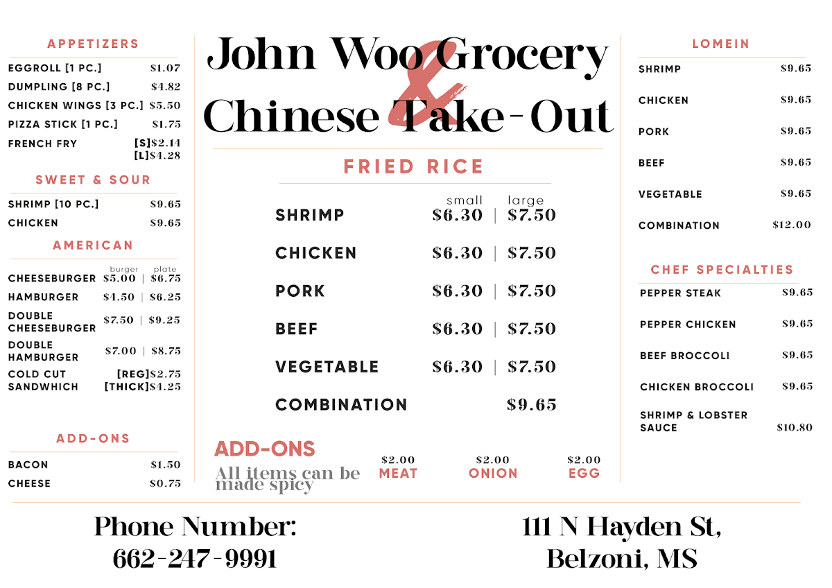 Home style Chinese and American food. Seasoned well . Big portions for a decent price.