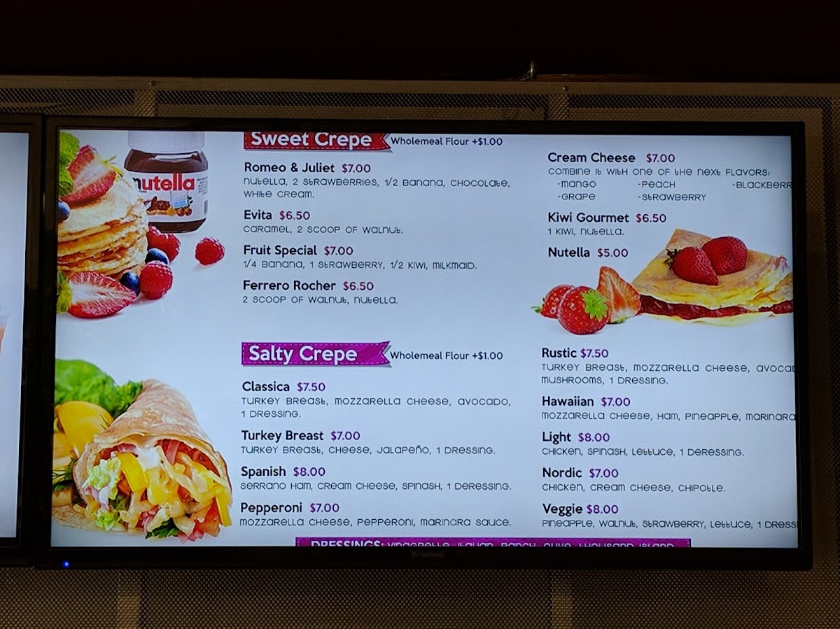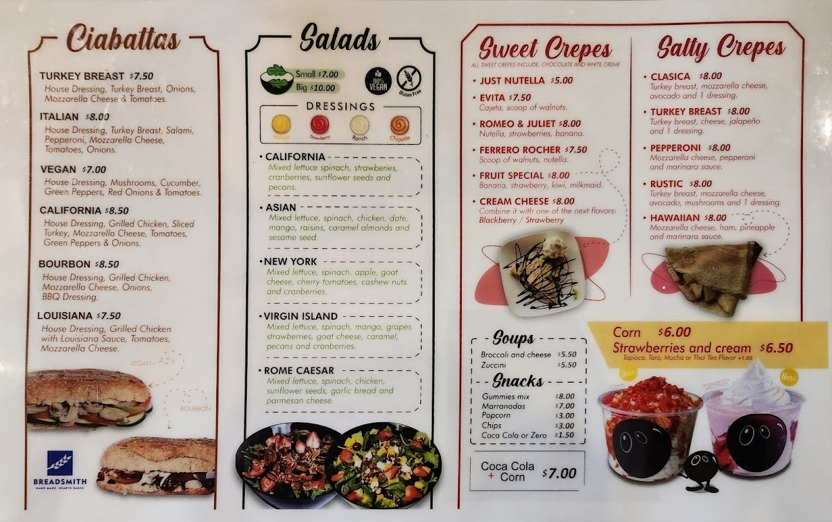 Mixed lettuce, spinach, mango, grapes, strawberries, goat cheese, caramel, pecans and cranberries.