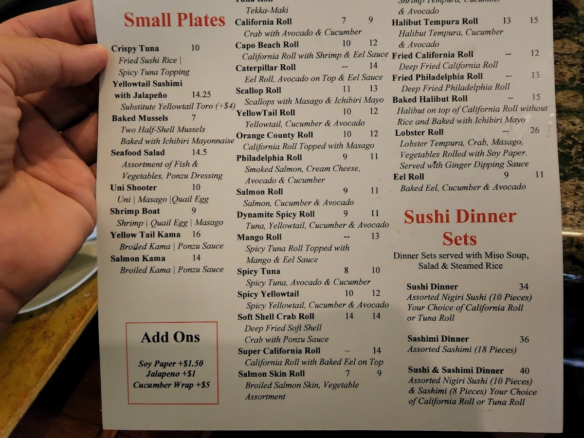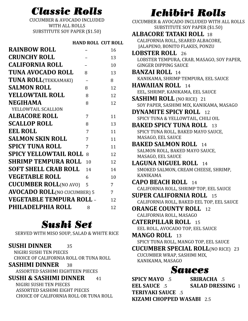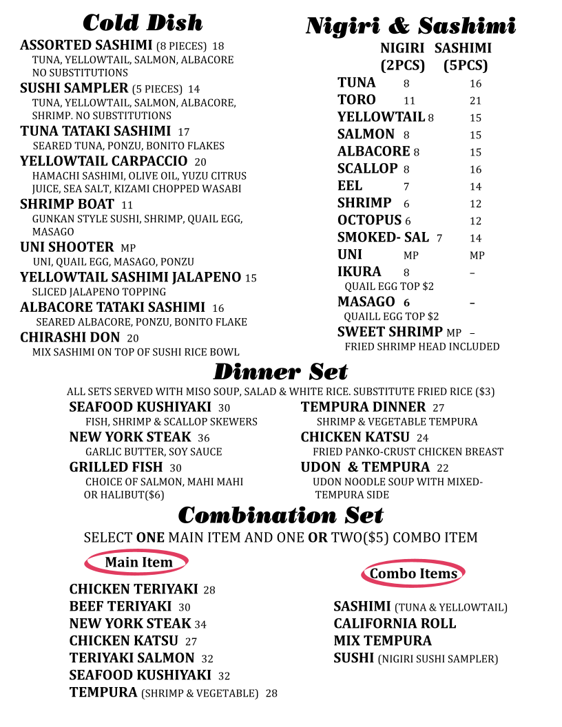 10 pieces of assorted sushi (tuna, yellow tail, fresh salmon white fish, shrimp, eel albacore, & octopus) and 8 pieces of sashimi (tuna, yellow tail white fish & fresh salmon) served with a tuna roll or california roll