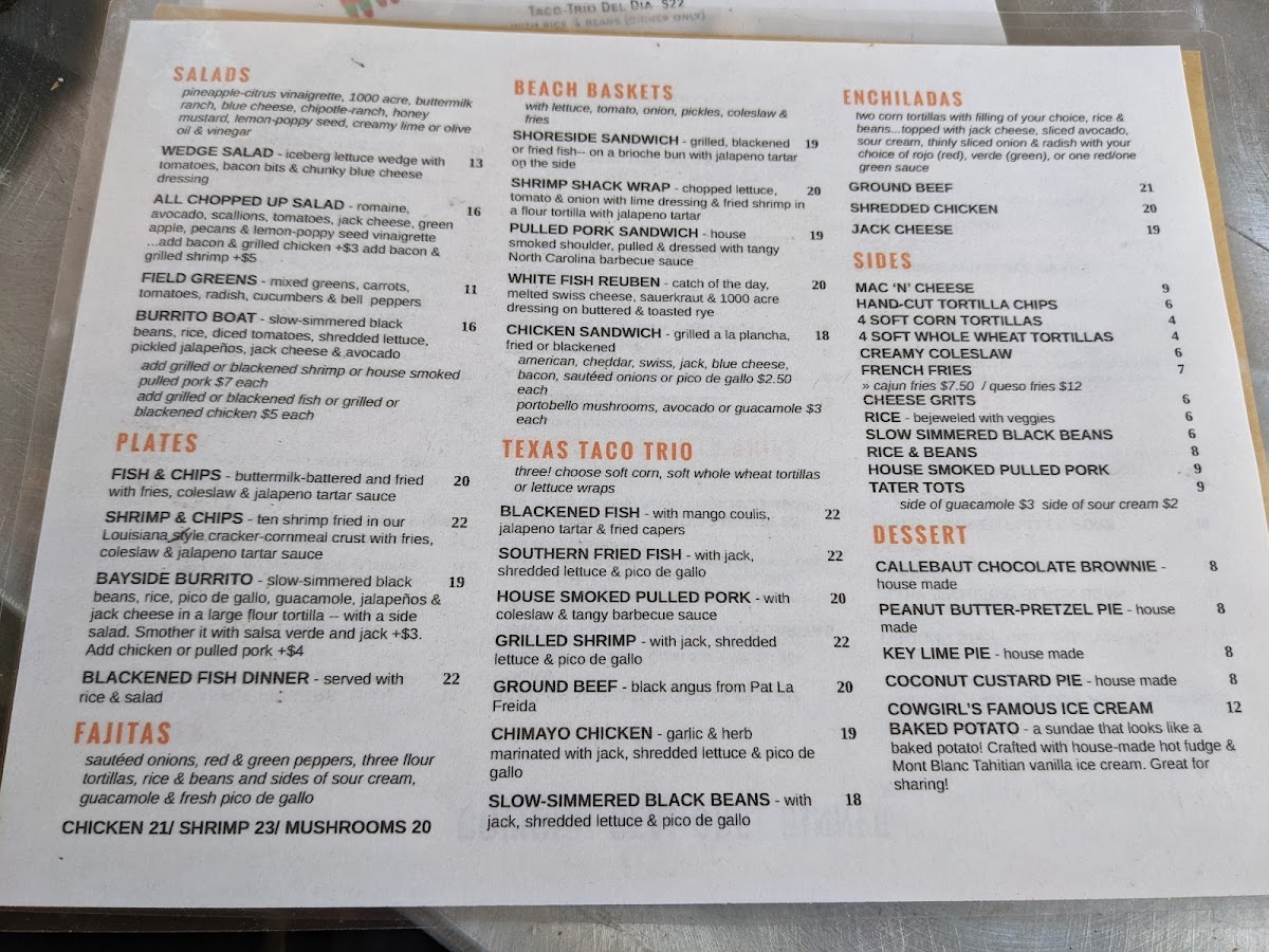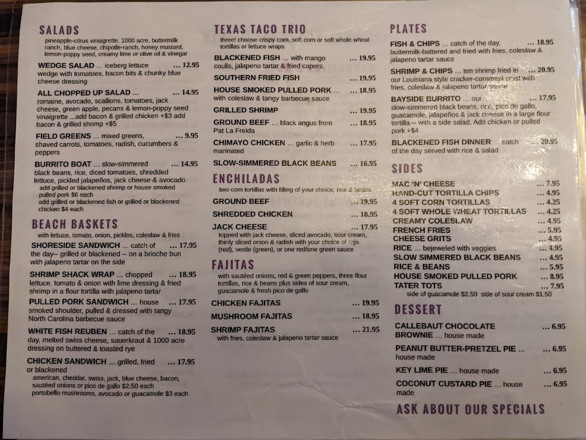 Chopped lettuce, tomato and onion with lime dressing and fried shrimp in a flour tortilla with jalapeno tartar. With lettuce, tomato, onion, pickles, coleslaw and fries.