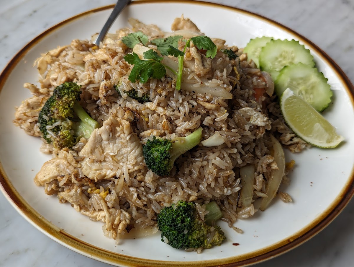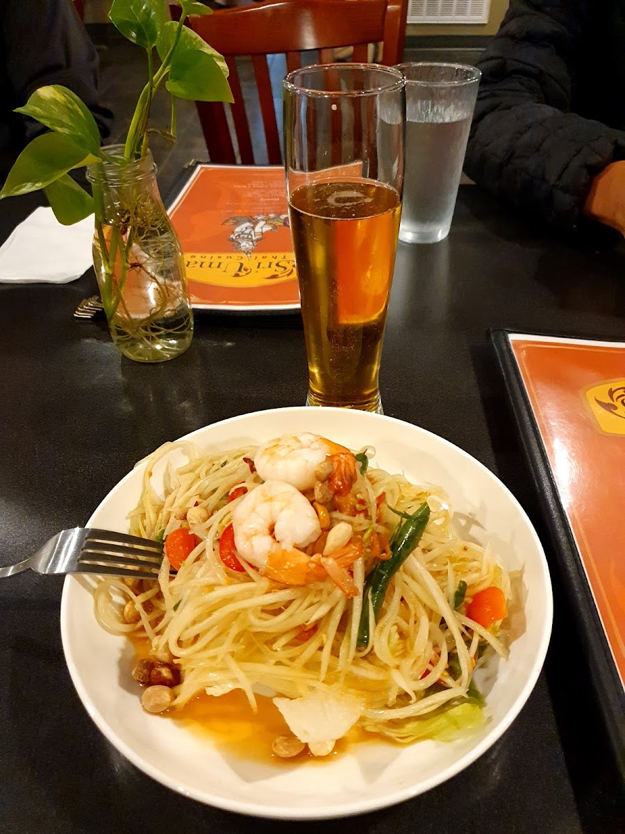 The food is nice here. Very large portions, flavors are good, lots of menu choices. We particularly like the crab fried rice, pad Thai and papaya salad. The garlic calamari is nicely spoke and delicate. The sauce is a bit lazy as it’s just the bottled sweet chili sauce you can get off the shelf. The garlic crispy chicken was slightly overcooked and a bit too salty. Everything is a bit salty here so order some white rice to help tone it down.