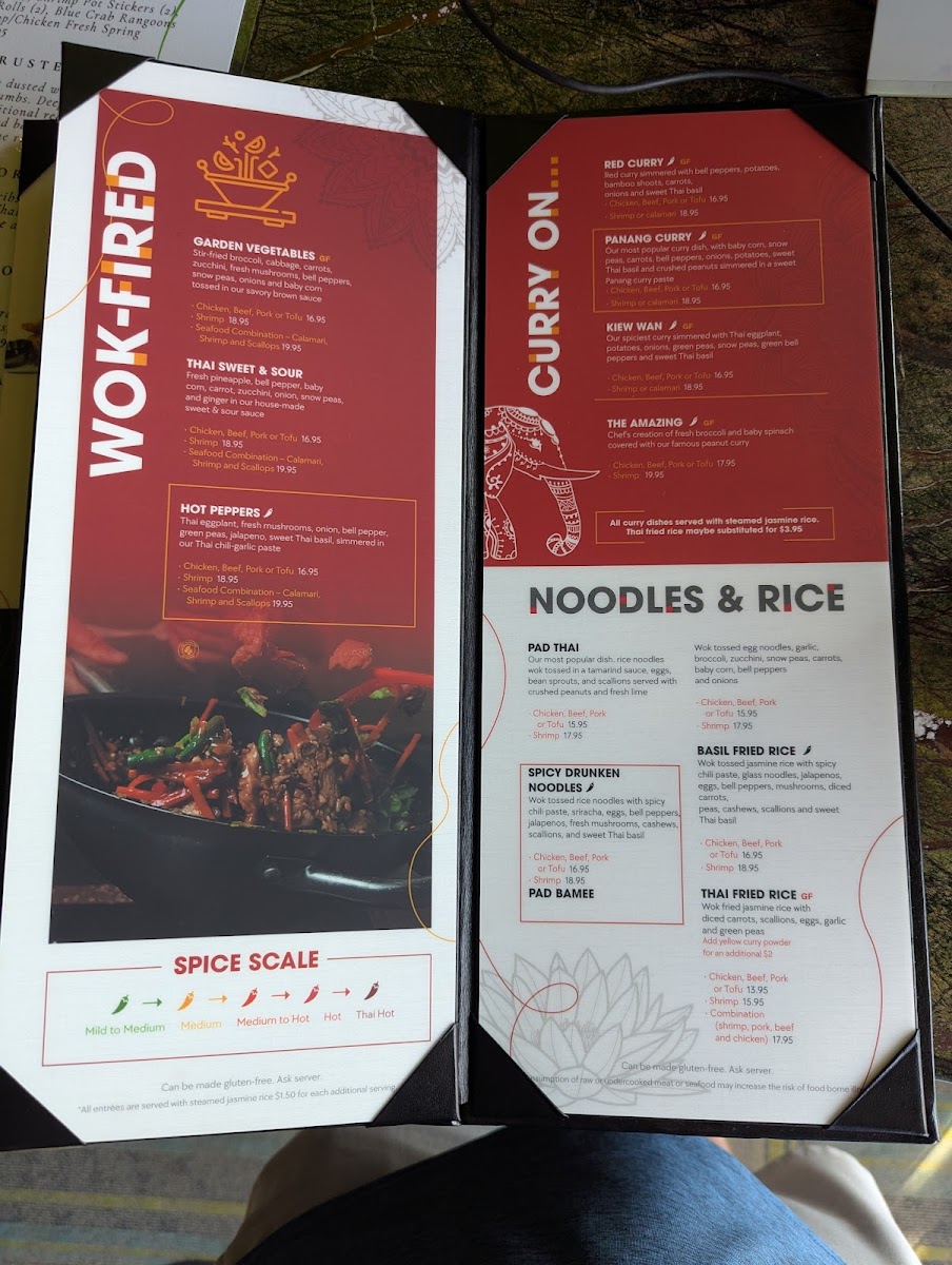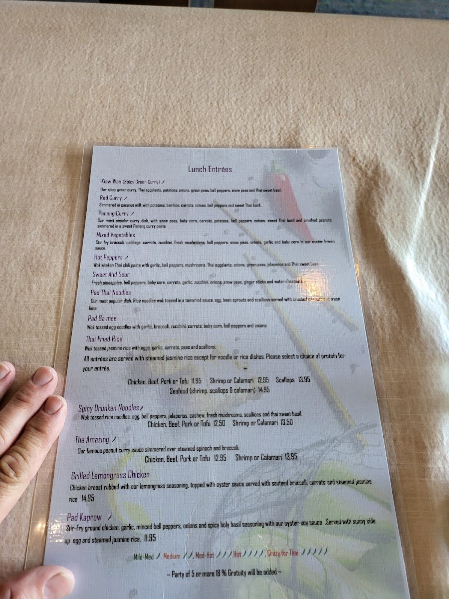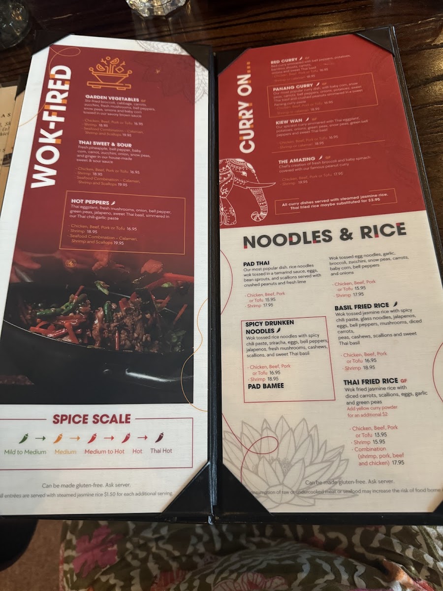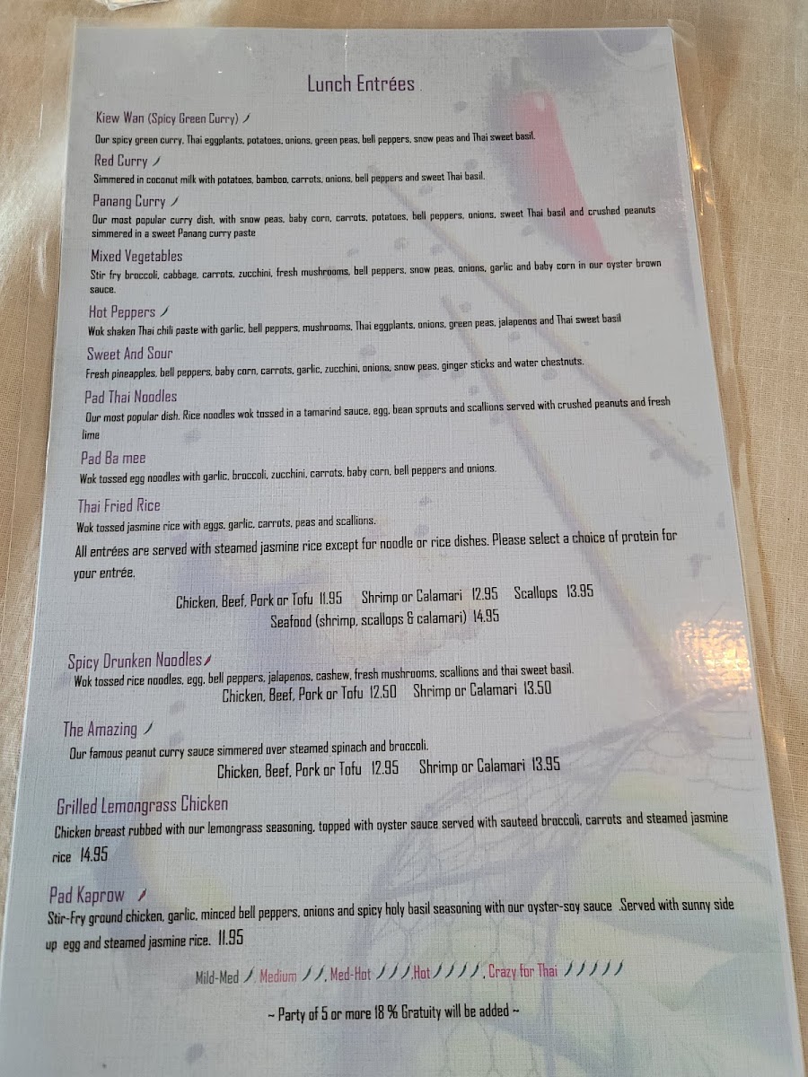 Wok shaken Thai chili paste with garlic, bell peppers, mushrooms, Thai eggplants, onions, green peas, jalapenos, and Thai sweet basil.