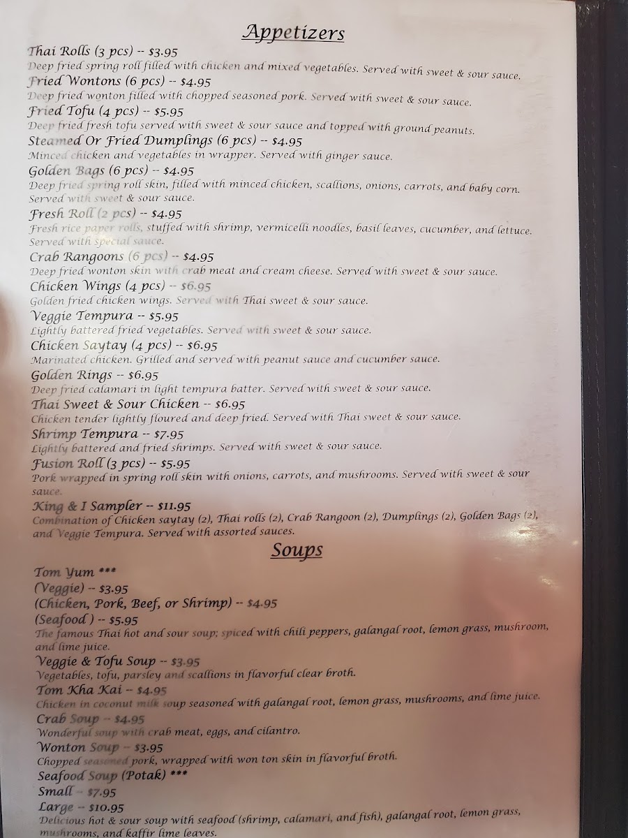 Combination of chicken saytay 2 pieces, Thai rolls 2 pieces, crab Rangoon 2 pieces, dumplings 2 pieces, golden bags 2 pieces, and veggie tempura. Served with assorted sauces.