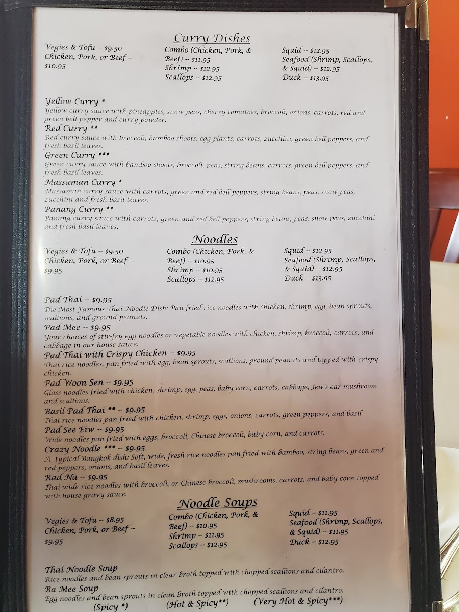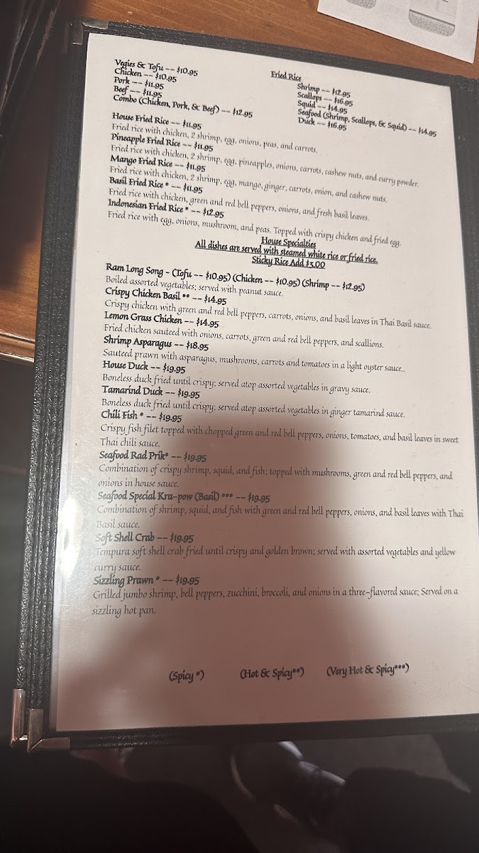 Thai rice noodles pan fried with chicken, eggs, onions, carrots, green bell peppers, and basil. Hot and spicy.