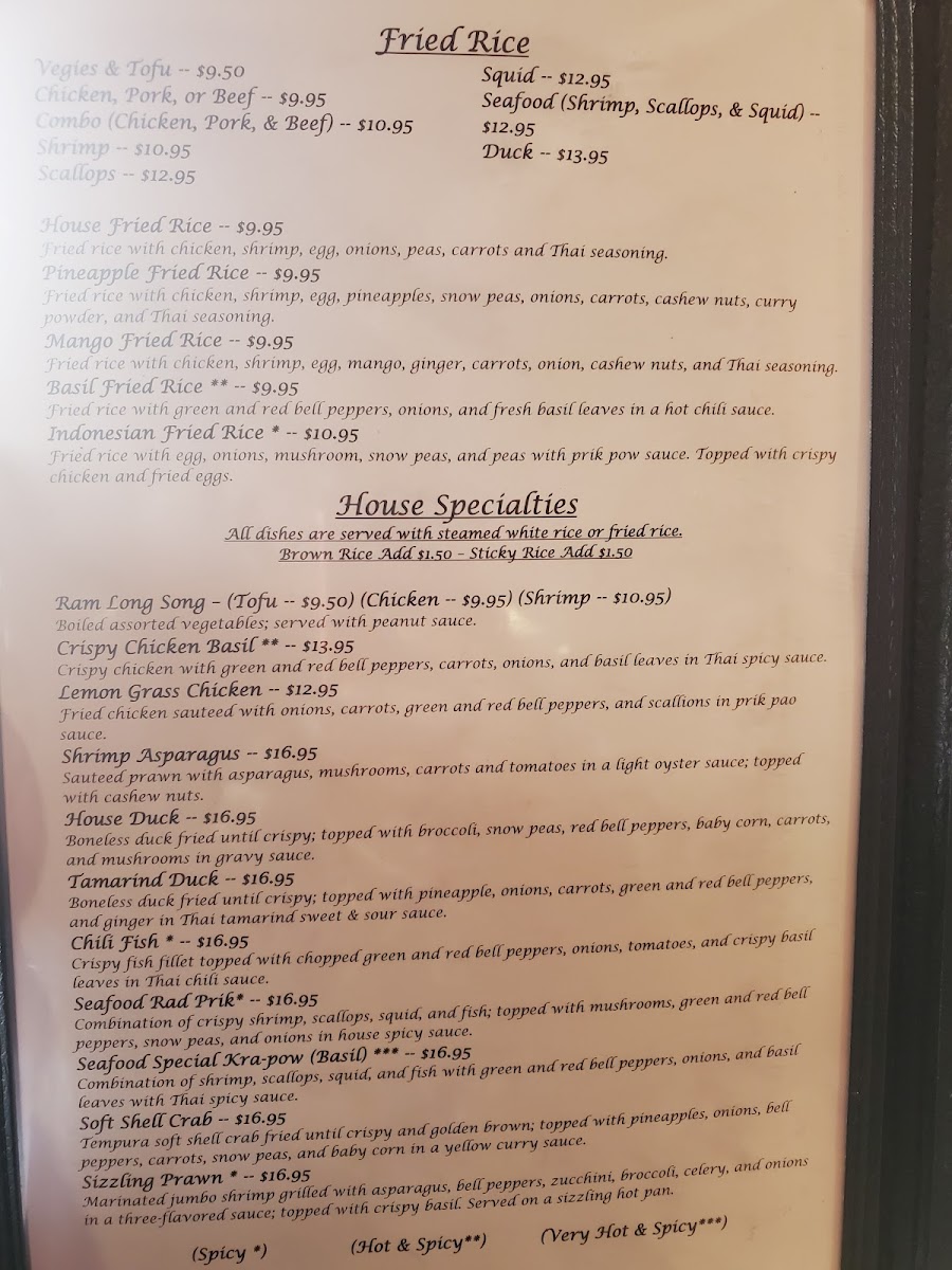 Carrots, mushrooms, onions, pineapples, green and red bell peppers, cashew nuts, and scallions in Thai house sauce. Spicy.