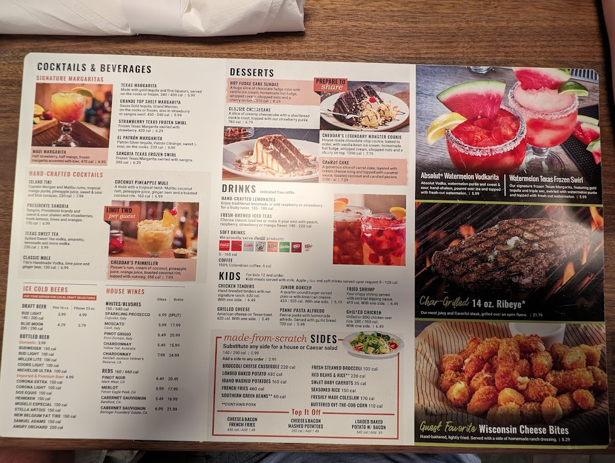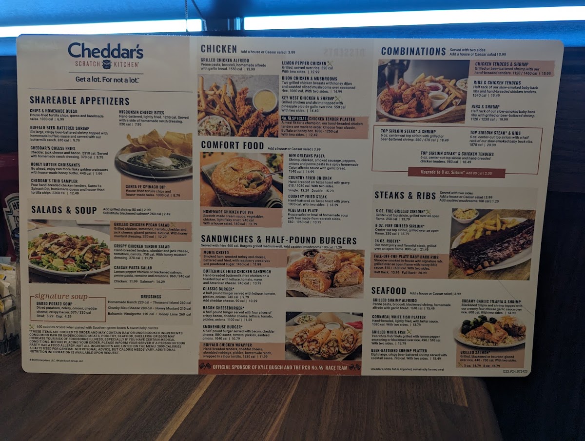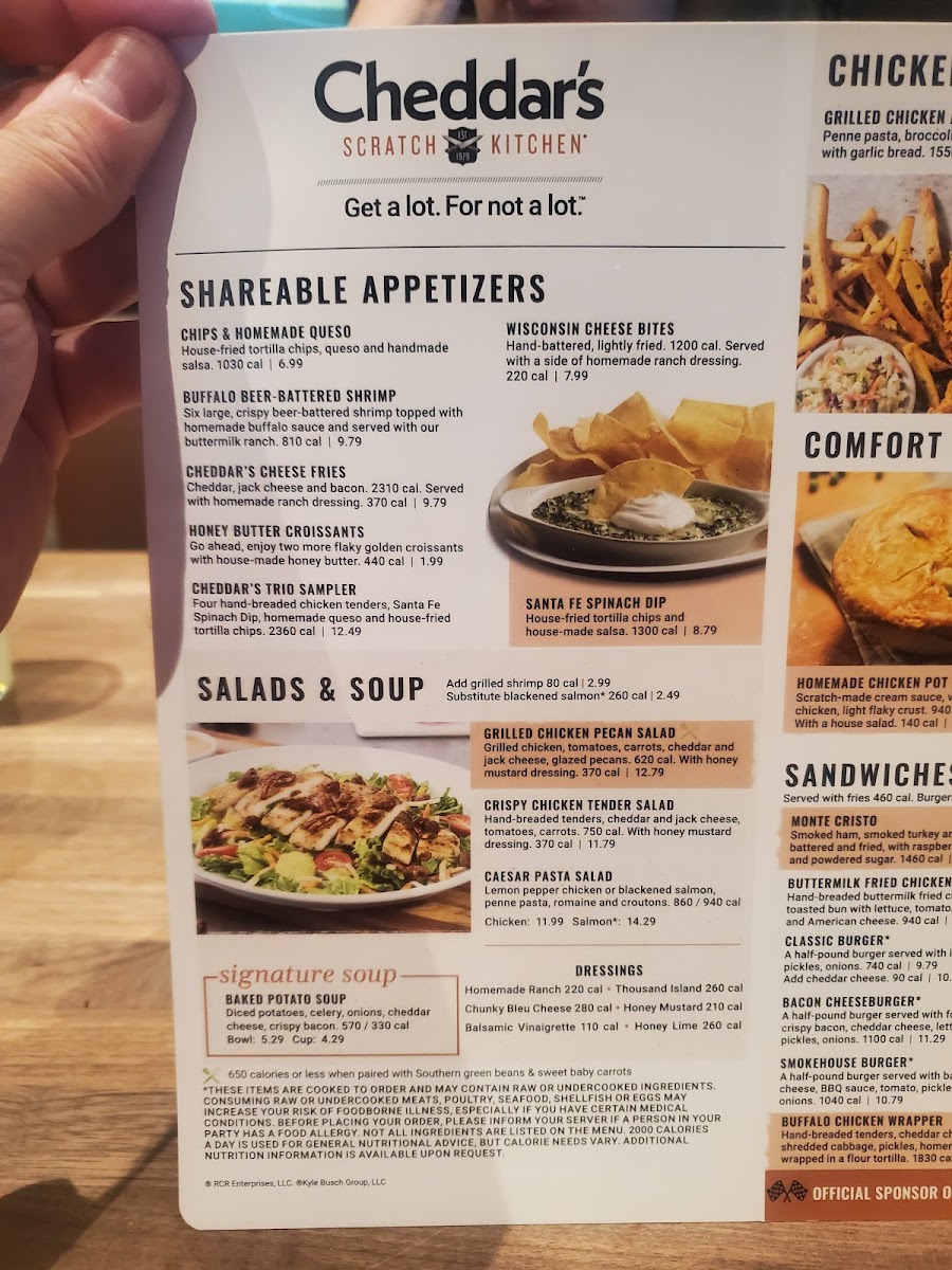 Choose three homestyle appetizers. Chips & Homemade Queso, Santa Fe Spinach Dip, Hand-Breaded Chicken Tenders, Wisconsin Cheese Bites or Cheddar's Queso Fries.